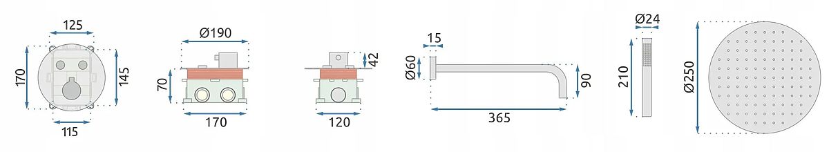 Wir präsentieren Ihnen das Unterputz-Duschset aus der Lungo-Serie. Dank seiner Vielseitigkeit und erstaunlichen ästhetischen Eigenschaften ist das Set eine ausgezeichnete Wahl für jeden Badezimmerbesitzer. Die modernen Aufputzelemente sind mit einer vierfachen Beschichtung von höchster Qualität überzogen. Diese Technik schützt die Armatur vor Korrosion und Verfärbung. Das Set umfasst eine runde Regendusche, eine Armatur mit Elementen, einen Schlauch mit Duschkopf und ein Punktset. Das Set ist ideal für diejenigen, die nach ungewöhnlichen Lösungen suchen und ein originelles und einzigartiges Traumbad schaffen möchten. Das vorgestellte Duschset hat keine Wasserdruckregelung.