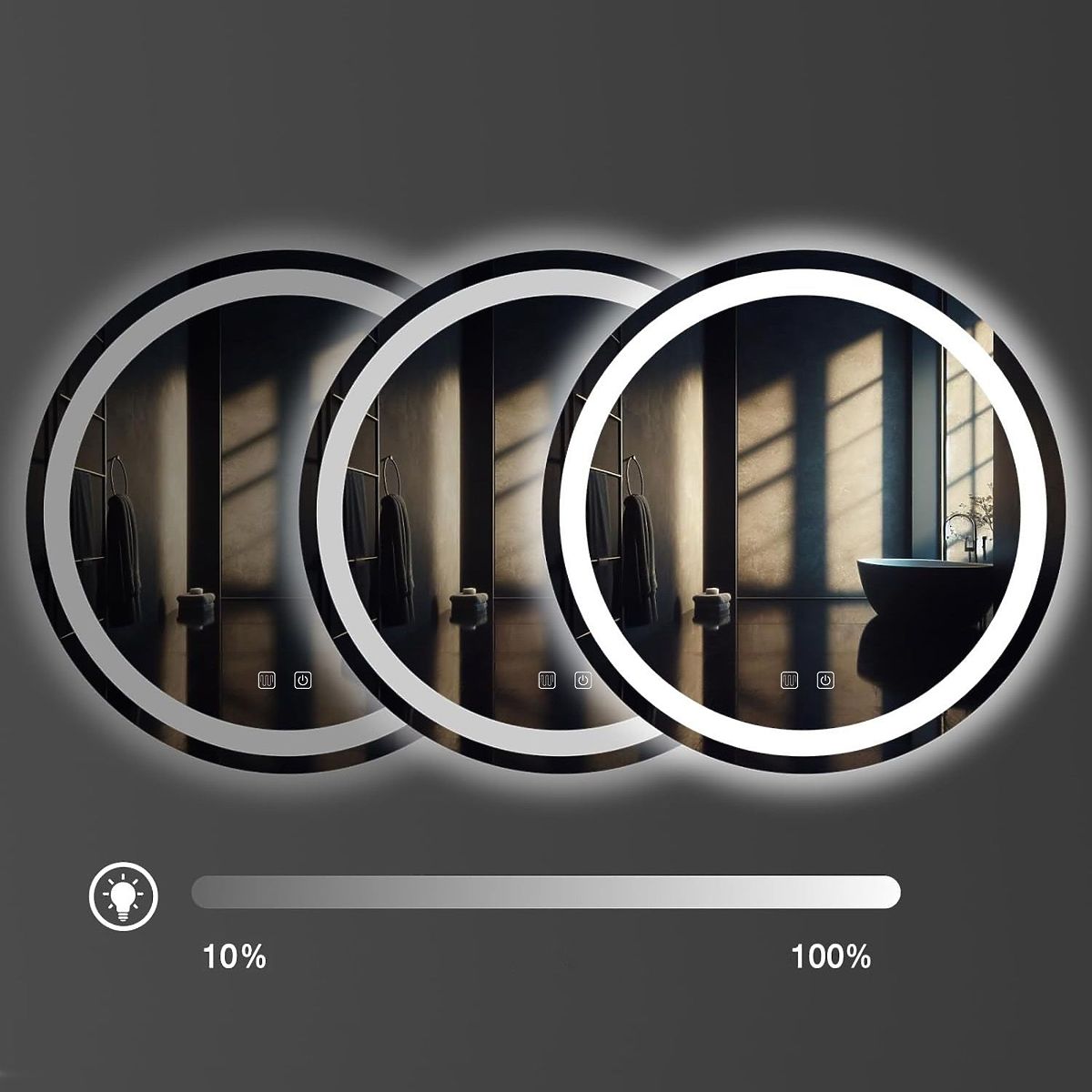 Der runde Spiegel mit LED-Beleuchtung ist die ideale Wahl für diejenigen, die Komfort und modernes Design schätzen. Der Spiegel besteht aus Materialien höchster Qualität, präsentiert sich perfekt und ist sehr langlebig. Er bietet drei per Touch wechselbare LED-Lichtfarben – warm, neutral und kalt – sowie eine Heizfunktion, die das Beschlagen der Oberfläche verhindert. Der Touch-Schalter, der sich auf der Spiegelfläche befindet, leuchtet bei Aktivierung der Funktion blau. Weißes Netzkabel mit einer Länge von 115 cm. LED-Rahmen: ca. 3,5 cm Abstand des LED-Rahmens vom Rand: ca. 2,5 cm.