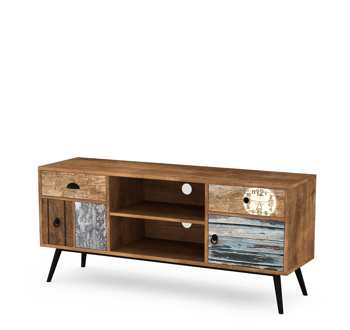 Mehrfarbiger TV-Schrank aus laminiertem Holz und Stahl. .. mehr