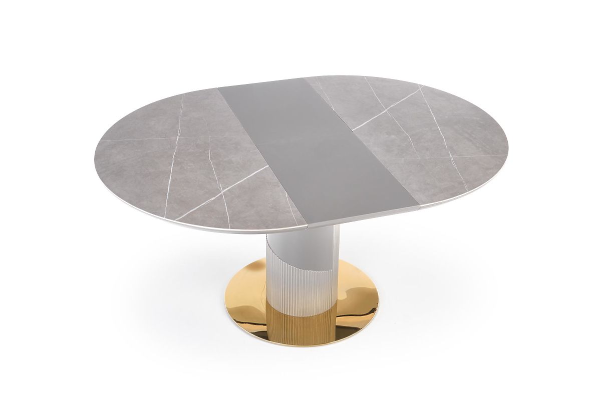 Ausziehbarer Tisch mit grauer Marmorplatte und hellgrau-goldenem Bein. .. mehr