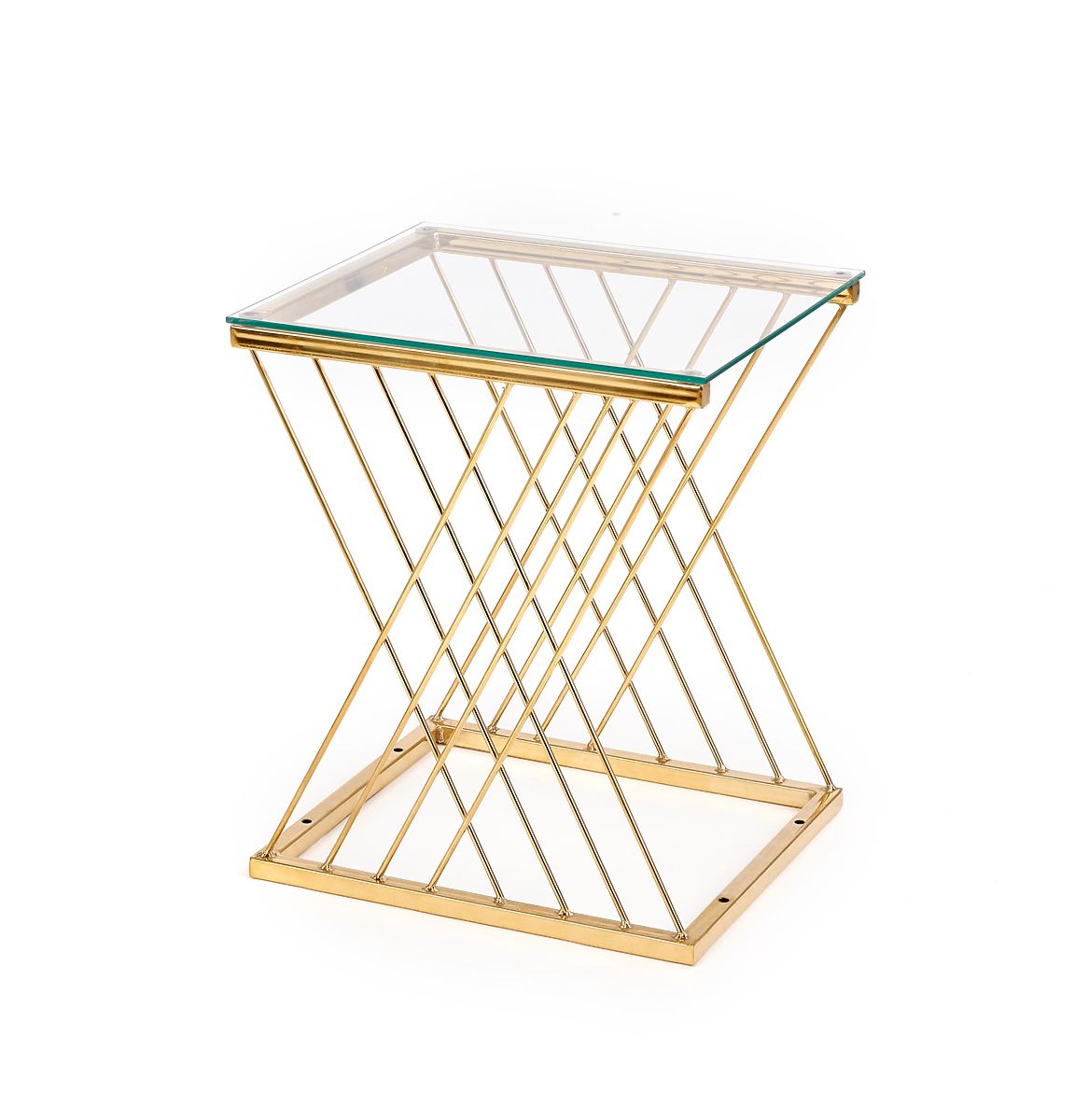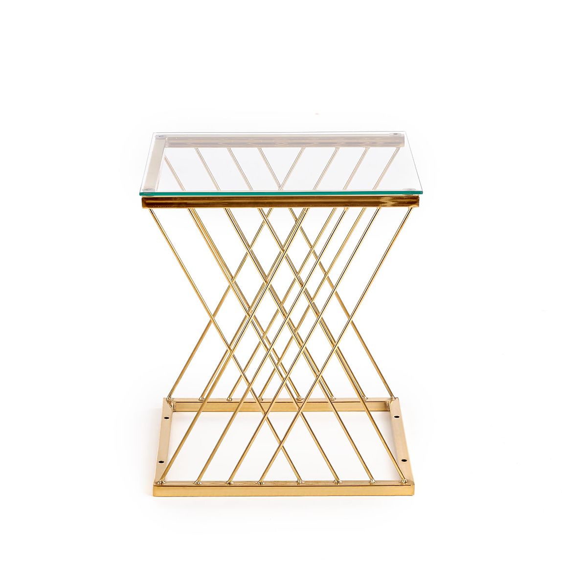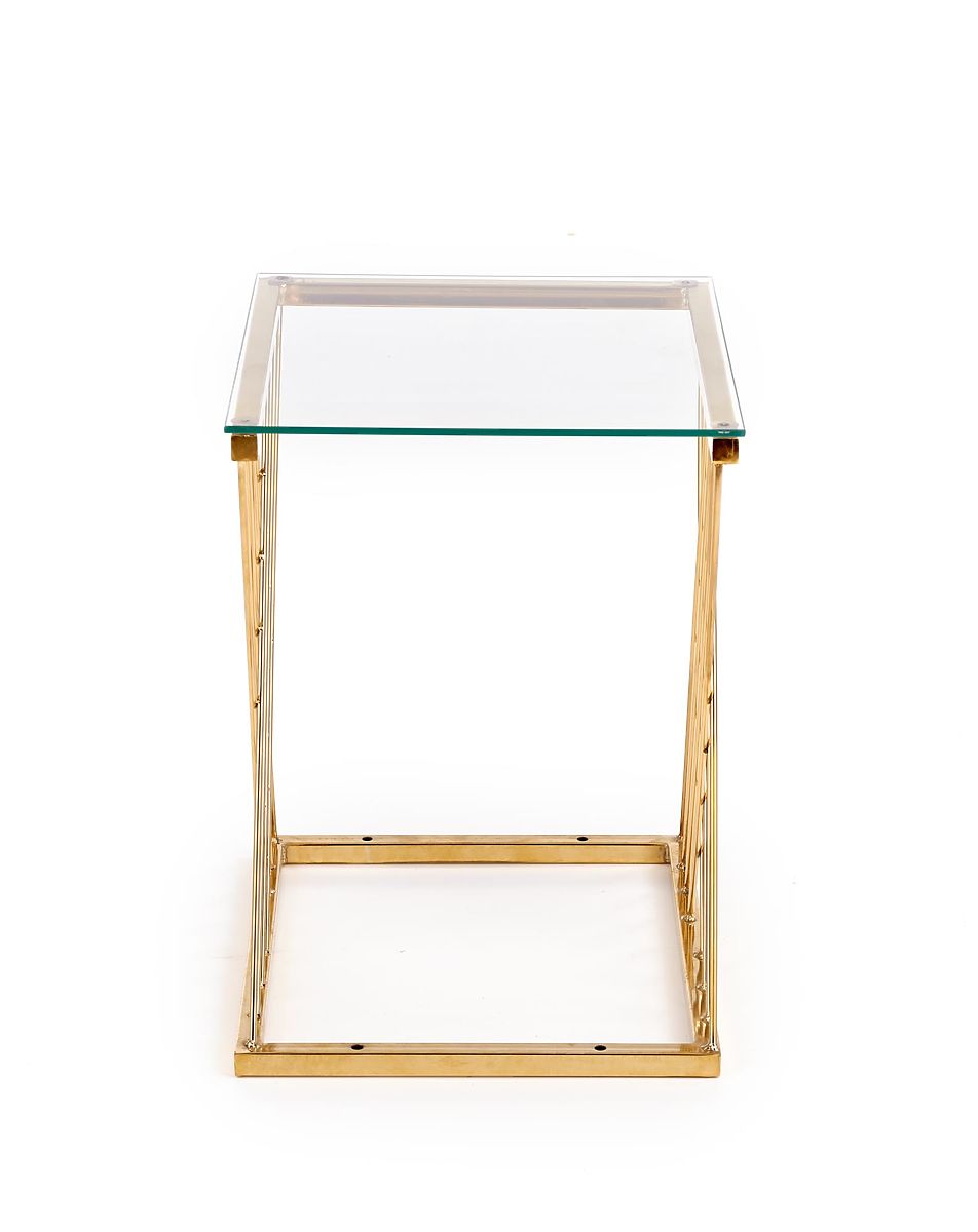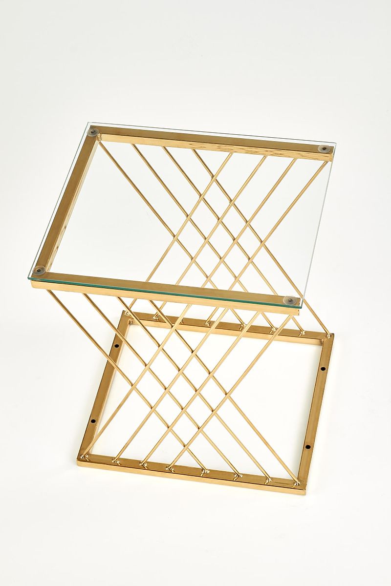 Stilvoller Beistelltisch mit transparentem Glas und goldfarbenem Stahl. .. mehr