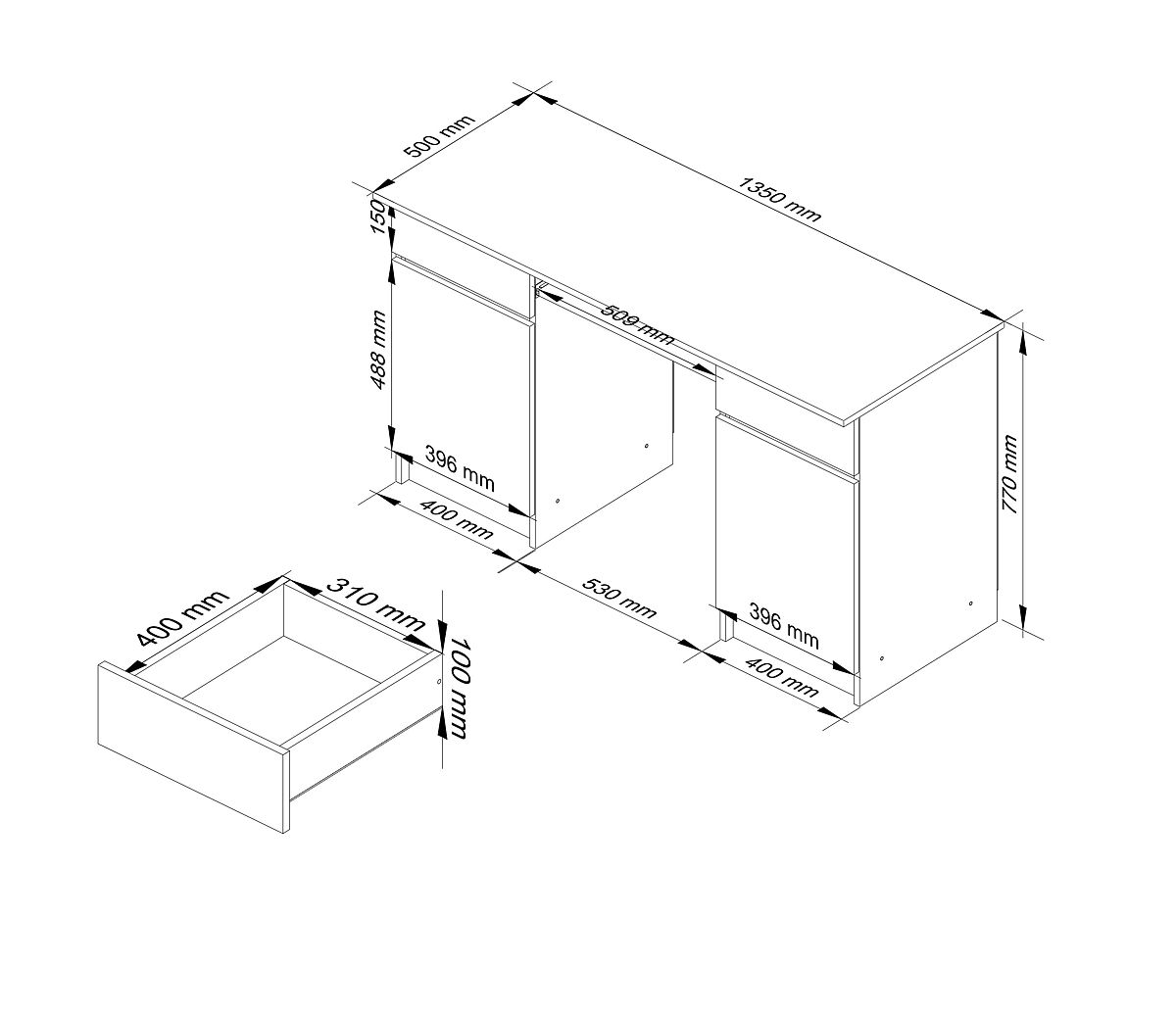 Der Schreibtisch A5 besteht aus einer hochwertigen, robusten laminierten Platte mit einer Stärke von 16 mm. Sowohl der Korpus als auch die Fronten dieses Möbels sind in einer modischen und universellen weißen Farbe erhältlich. Das Möbelstück ist mit einem praktischen Tastaturregal, zwei Schubladen und zwei Schränken ausgestattet, was erheblichen Stauraum bietet. Die Tischplatte hat eine Länge von 135 cm und eine Tiefe von 50 cm, sodass sie groß genug ist, um bequem einen Monitor, Laptop oder Schreibutensilien unterzubringen. Dieser Tisch ist geräumig und gleichzeitig kompakt, da er eine Höhe von 77 cm hat und jede Schublade und jeder Schrank 40 cm lang ist. Dank seiner Abmessungen und seines ästhetischen, modernen Aussehens eignet sich dieses Modell hervorragend sowohl für das Studentenzimmer als auch für das Büro.