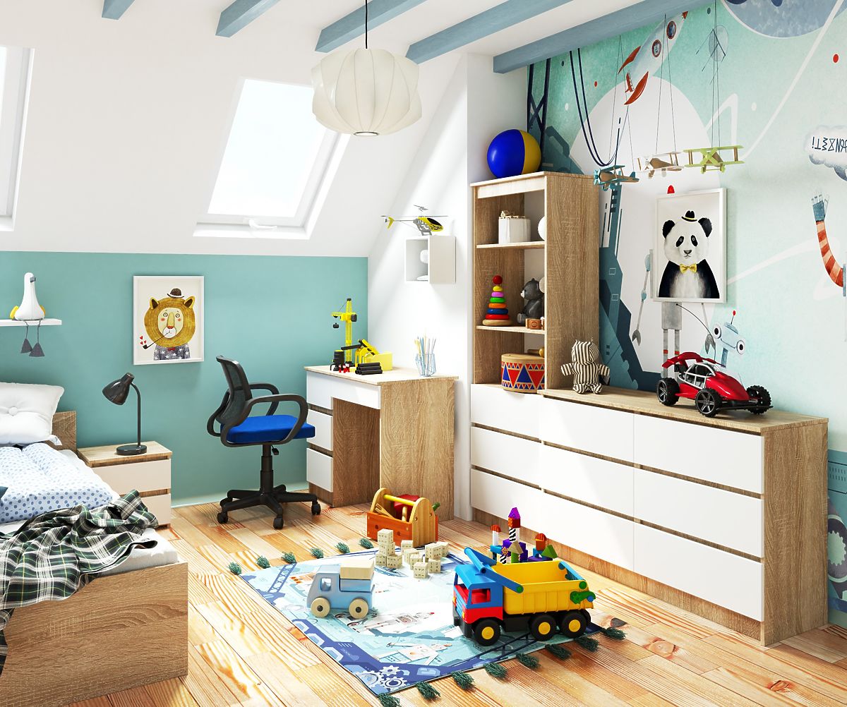 Ein Schreibtisch mit vier Schubladen, der für Jugendliche konzipiert ist.