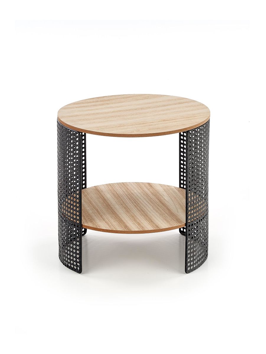 Der Couchtisch Trafica ist ein modernes Möbelstück, das durch seine originelle Konstruktion und Liebe zum Detail besticht. Er ist für Liebhaber praktischer, aber gleichzeitig ästhetisch ausgefeilter Lösungen konzipiert, die dem Interieur einen individuellen Charakter verleihen. Das dominierende Element des Tisches sind Stahlbeine mit Pulverbeschichtung, deren ungewöhnliche Textur mit feinen Perforationen einen markanten visuellen Effekt erzeugt. Diese Details verleihen dem Tisch einen modernen industriellen Touch und machen ihn zu einem auffälligen Accessoire im Wohnzimmer oder Entspannungsbereich. Die runde Tischplatte besteht aus MDF-Platte mit natürlichem Furnier und sichtbarer Holzmaserung, die Wärme und eine gemütliche Atmosphäre in den Raum bringt. Ein praktischer Vorteil ist das zusätzliche untere Regal, ideal zum Ablegen von Büchern, Zeitschriften oder Kleinigkeiten, die Sie beim Entspannen immer griffbereit haben möchten. Dank seiner kompakten Abmessungen passt der Couchtisch Trafica nicht nur in Wohnzimmer, sondern auch in kleinere Räume, Leseecken oder moderne Entspannungsbereiche. Er vereint Funktionalität, modernes Design und den natürlichen Look der Materialien zu einem harmonischen Ganzen.