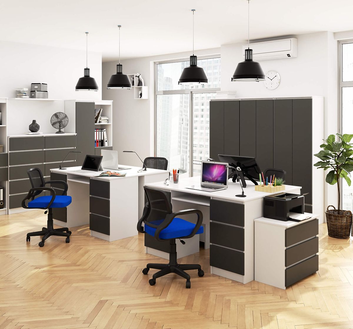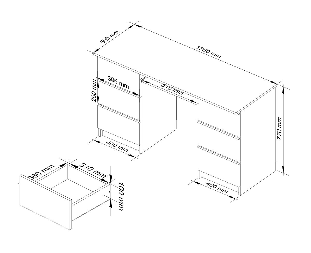 Der Computertisch A-11 hat eine Breite von 135 cm und eine Höhe von 77 cm. Die Schubladen befinden sich sowohl auf der linken als auch auf der rechten Seite des Möbelstücks. Dank dieser Größe und soliden Verarbeitung können Sie sicher sein, dass der Tisch jedem Mitarbeiter gerecht wird. Wir empfehlen auch, den Rest der Kollektion zu betrachten, mit der Sie das ideale Set für Ihr Büro erstellen können.