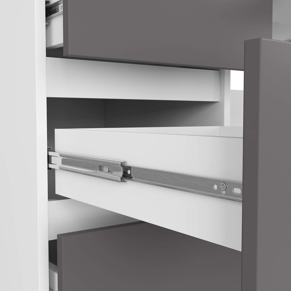 Ob Sie im Büro oder von zu Hause aus arbeiten, Sie verbringen täglich mehrere Stunden am Tisch. Sie wissen, dass die Wahl dieses Möbelstücks den Komfort Ihrer Arbeit erheblich beeinflusst. In dieser Rolle bewährt sich der Computertisch A-11 hervorragend. Er verfügt über 6 geräumige Schubladen mit einer Tiefe von 34,5 cm, in denen Sie problemlos alle Dokumente und Geräte unterbringen können. Der Tisch hat auch ein ausziehbares Regal, auf dem Sie bequem die Tastatur platzieren oder die wichtigsten Notizen verstauen können. Die klassische Kombination aus Weiß und Grafitgrau passt hervorragend zu einfachen, eleganten Büros.