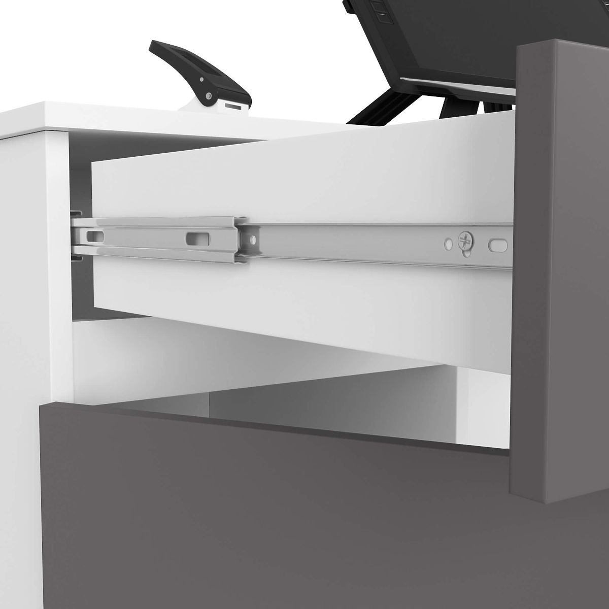 - Schubladen und Tastaturablage bewegen sich auf Metallkugelführungen