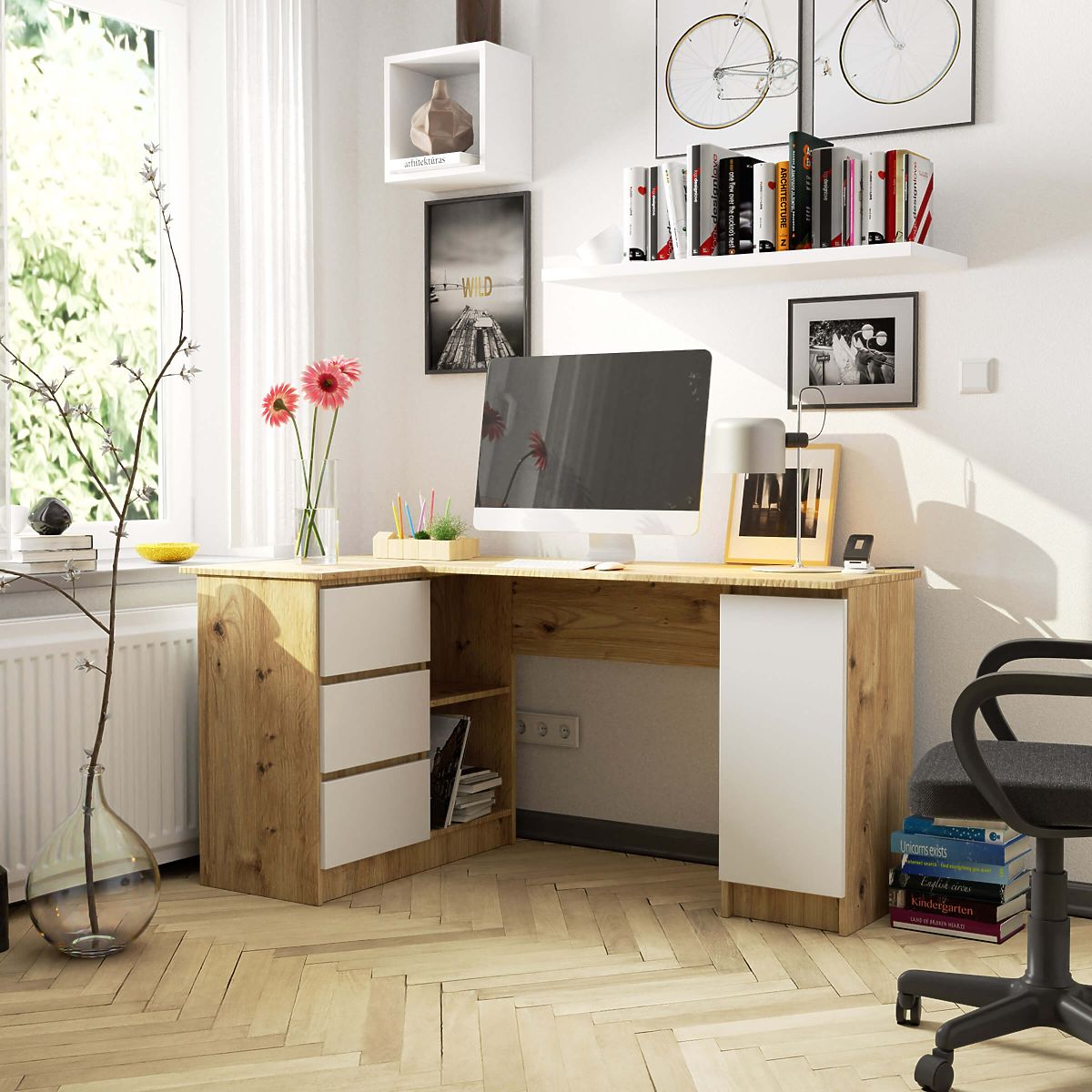 Der Eckschreibtisch B20 155 cm LINKS in der Farbe Eiche Artisan mit weißen Frontflächen ist ein elegantes Büromöbel mit modernem Design. Er ist eine hervorragende Wahl für Home-Offices und Kinderzimmer. Der Eckschreibtisch fügt sich in die Raumgestaltung ein und schafft einen geeigneten Raum zum Arbeiten und Lernen. Dank der Schubladen, Regale und des Schranks, die auf beiden Seiten des Tisches platziert sind, sind benötigte Gegenstände in Reichweite. Dokumente, Bücher oder Büromaterialien können leicht in den geräumigen Schubladen organisiert werden, die auf Rollenführungen laufen. Der Tisch ist aus 16 mm starkem Laminat der Marke Kronospan gefertigt, das abriebfest ist und somit eine lange Lebensdauer des Tisches garantiert. Die Kanten des Möbels sind mit einer ABS-Kante versehen, die Widerstandsfähigkeit gegen mechanische Beschädigungen bietet.