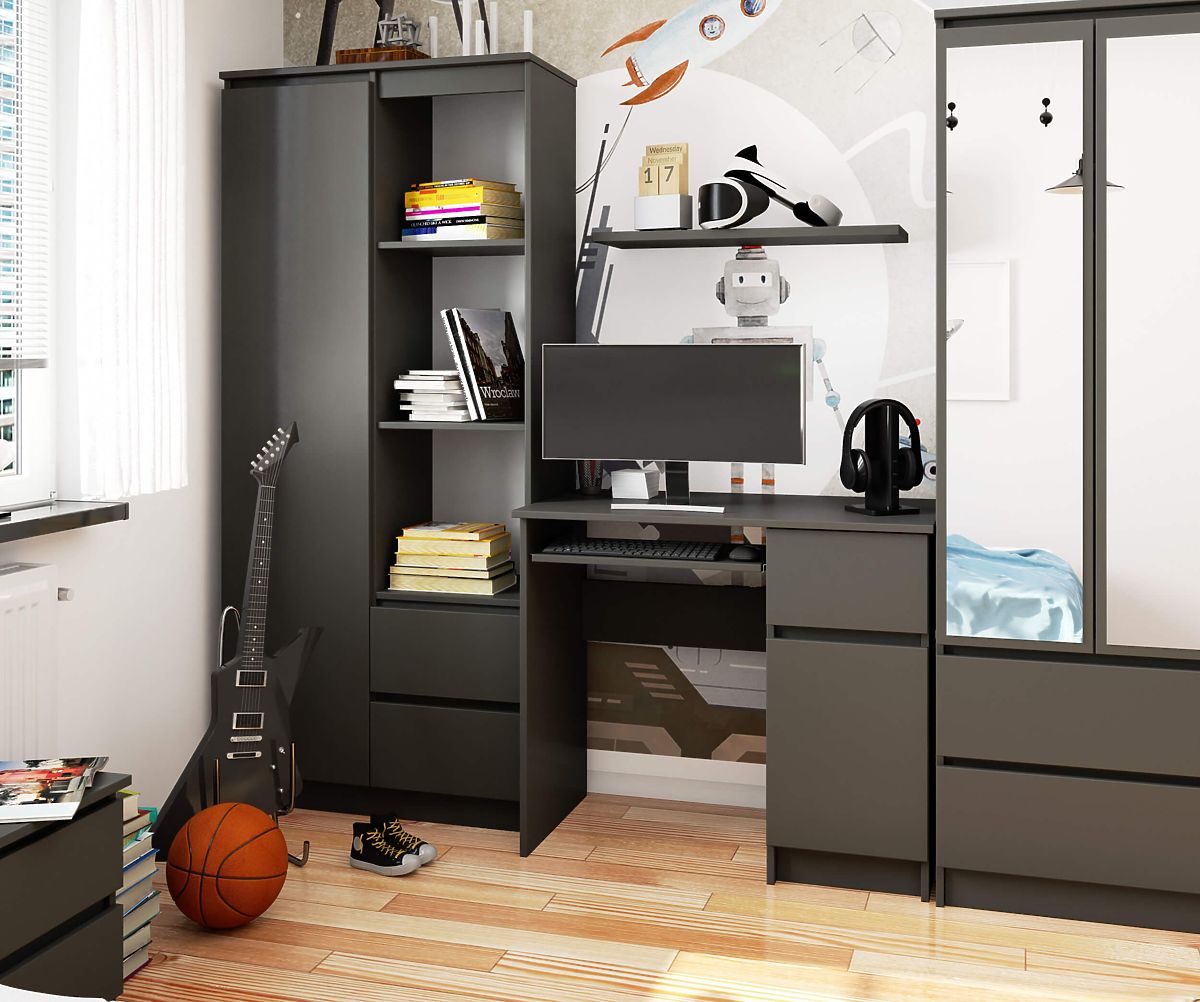 Der freistehende Tisch PIKSEL 90 cm in den Farben GRAPHIT GRAU ist die ideale Lösung für kleine Innenräume. Er eignet sich sehr gut als Schul- oder Computertisch. Seine ergonomische Konstruktion sorgt für Komfort bei der Nutzung. Der Tisch ist mit einem ausziehbaren Tastaturfach, einer praktischen Seitenschublade und einem Schrank mit Regal ausgestattet, in dem Ordner und Bücher leicht Platz finden. Für die Herstellung des Tisches wurde eine angenehme und pflegeleichte matte Platte verwendet, die mit einer strapazierfähigen Laminatschicht überzogen ist. Praktische Griffe in Silberfarbe runden das Gesamtbild ab.