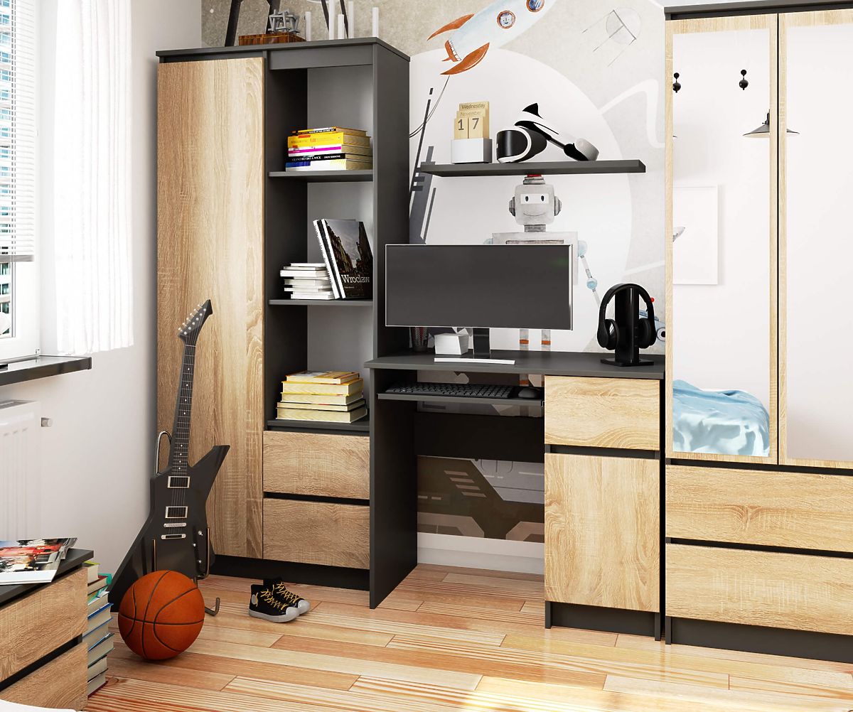 Der freistehende Tisch PIKSEL 90 cm in den Farben GRAFIT GRAU/EICHE SONOMA ist die ideale Lösung für kleine Innenräume. Er eignet sich sehr gut als Schul- oder Computertisch. Seine ergonomische Konstruktion sorgt für Komfort bei der Nutzung. Der Tisch ist mit einem ausziehbaren Tastaturfach, einer praktischen Seitenschublade und einem Schrank mit Regal ausgestattet, in dem Ordner und Bücher frei stehen können. Für die Herstellung des Tisches wurde eine matte Platte verwendet, die angenehm zu berühren und pflegeleicht ist, und mit einer strapazierfähigen Laminatschicht überzogen ist. Praktische Griffe in Silberfarbe runden das Ganze ab.