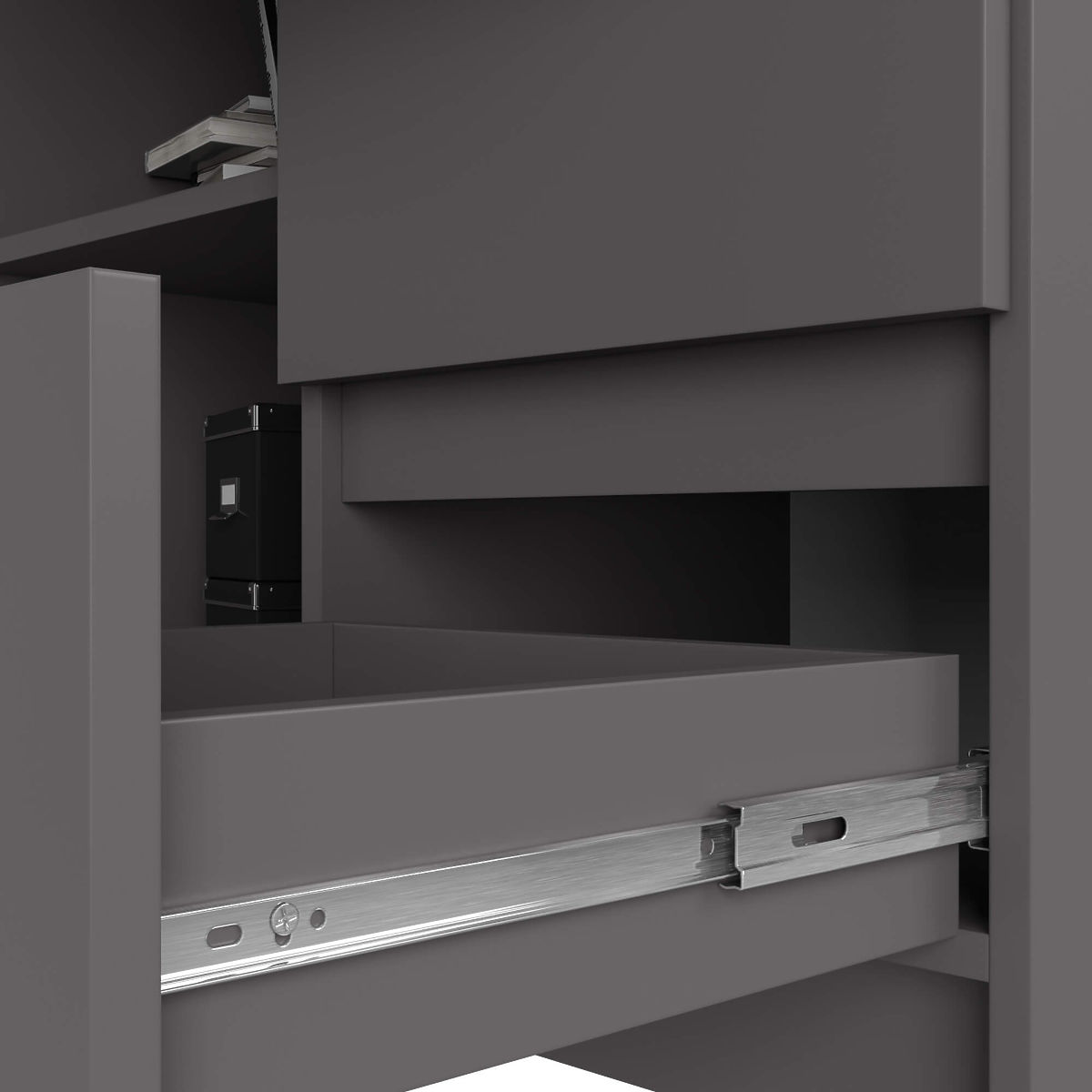 Eckschreibtisch B16 mit Regalen und Schubladen in graphitgrau. .. mehr