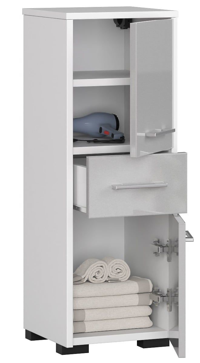 Der Badezimmersäule FIN mit Schublade und zwei Klapptüren ist aus hochwertiger, abriebfester laminierten Möbelplatte von Kronospan gefertigt. Der weiße Korpus des Möbels harmoniert hervorragend mit den Fronten aus hochglänzendem Acryl in metallischer Farbe. Unter der Plattenoberfläche der Säule befindet sich ein Schrank mit zwei Regalen und Türen. Darunter befindet sich eine Schublade und darunter ein weiterer Schrank – diesmal mit einem Regal. Der elegante Badezimmerschrank wird durch interessante, bequeme und einfache Griffe ergänzt.