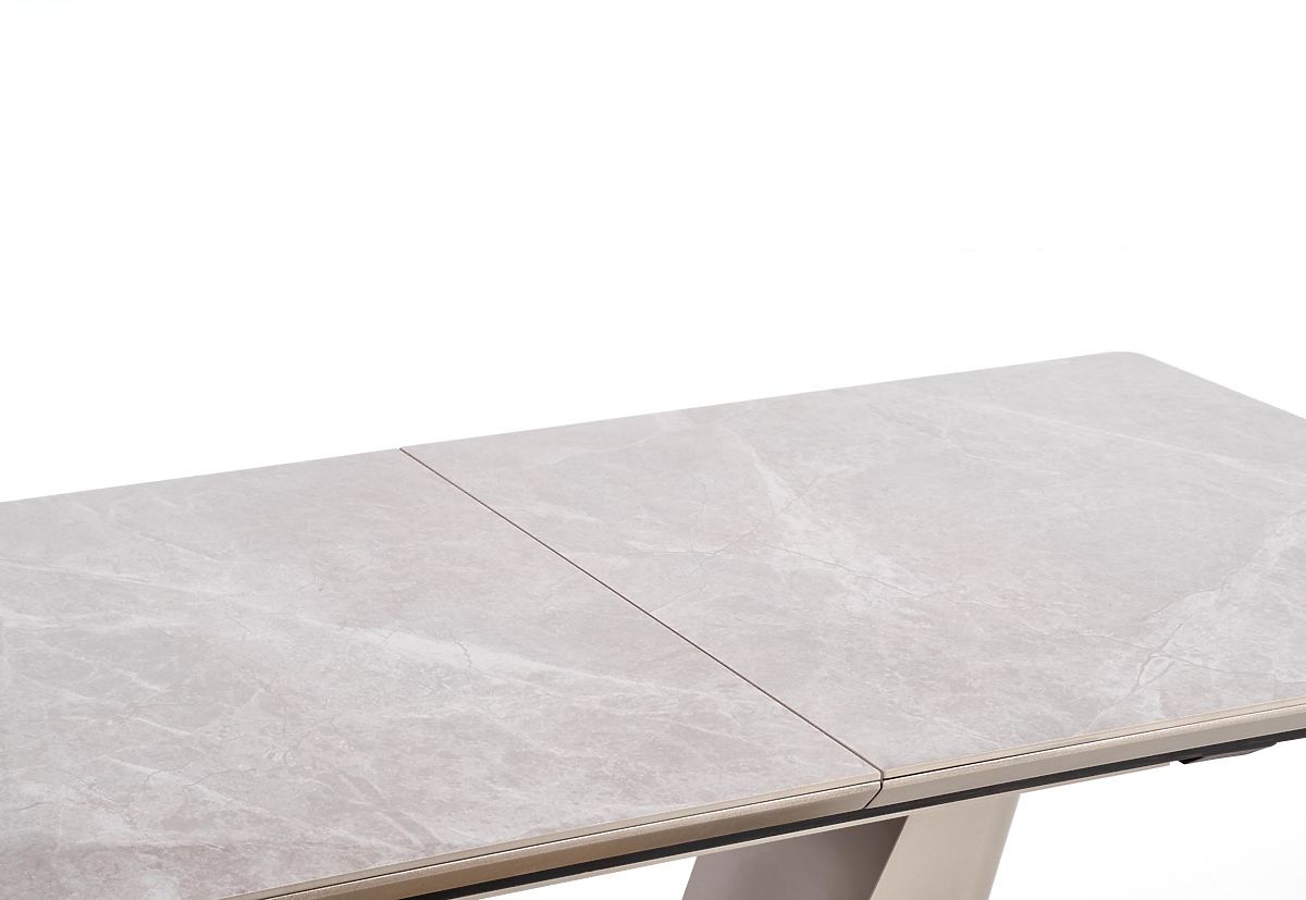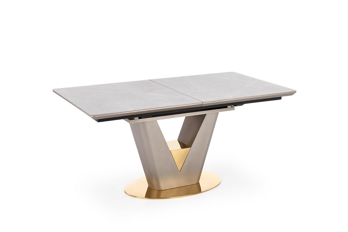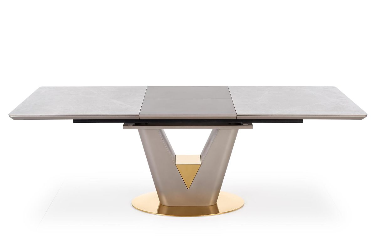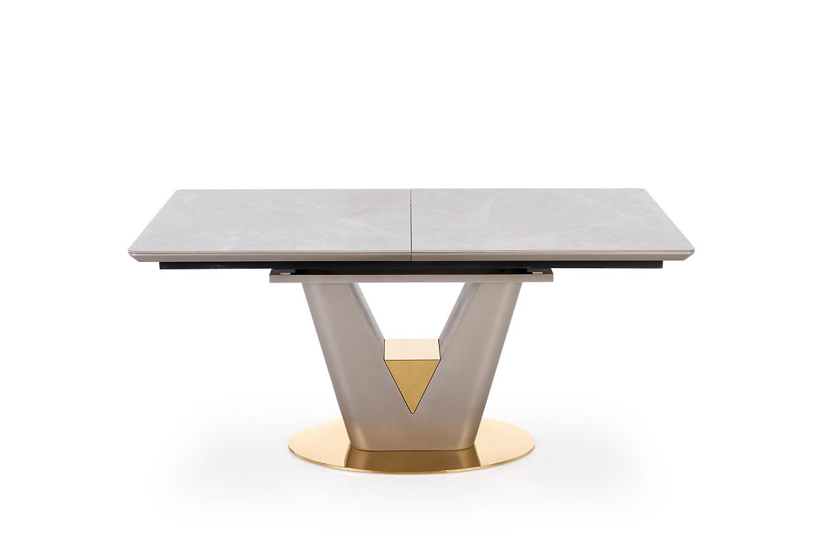 Der ausziehbare Esstisch VALENTINO von der Marke Halmar verkörpert moderne Eleganz, Luxus und Funktionalität. Dank seines exklusiven Designs wird er zum dominanten Element in jedem Esszimmer oder jeder Küche, die im modernen, glamourösen oder repräsentativen Stil eingerichtet ist. Die rechteckige Tischplatte mit abgerundeten Ecken und abgeschrägten Kanten besteht aus hochwertiger MDF-Platte, die mit hellgrauem Marmor-Furnier überzogen ist, was dem Tisch ein anspruchsvolles und zeitloses Aussehen verleiht. Ein praktischer Vorteil ist der ausziehbare Mechanismus, mit dem der Tisch leicht verlängert werden kann – nach dem Ausziehen wird die Fläche um zwei keramische Platten in grauem Farbton ergänzt. Der Tisch bietet somit bequem Platz für bis zu 8 Personen. Stabilität gewährleistet das massive V-förmige Stahlgestell, das im unteren Bereich mit einem goldenen Keil verziert ist. Goldene Akzente wiederholen sich auch auf der ovalen Basis des Tisches und schaffen zusammen mit der grauen Ausführung einen luxuriösen und harmonischen Kontrast. Der Tisch VALENTINO ist die ideale Wahl für diejenigen, die einen designorientierten, stabilen und praktischen Esstisch suchen, der sich sowohl dem täglichen Betrieb als auch festlichen Anlässen anpasst.