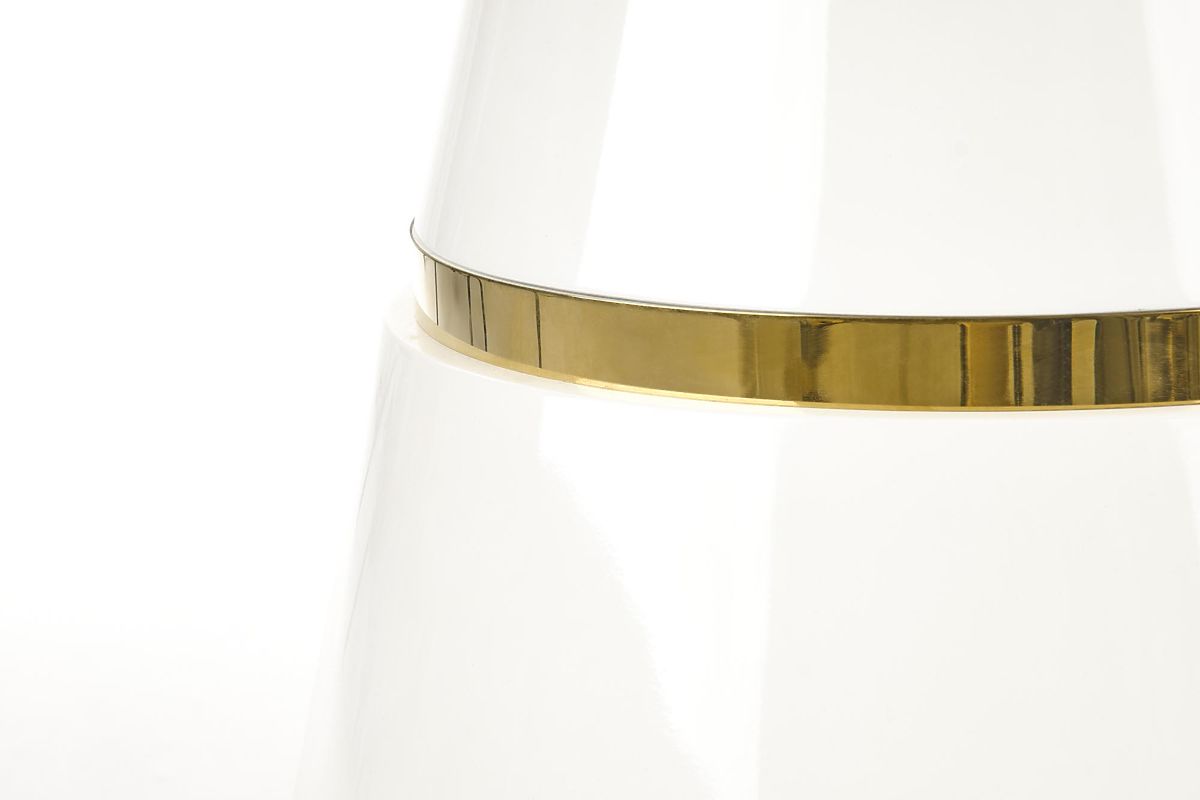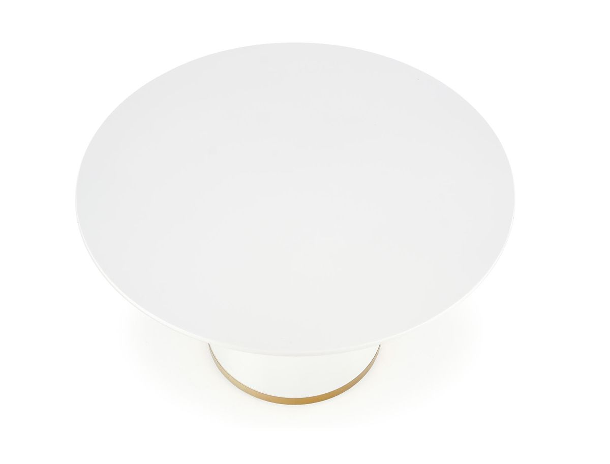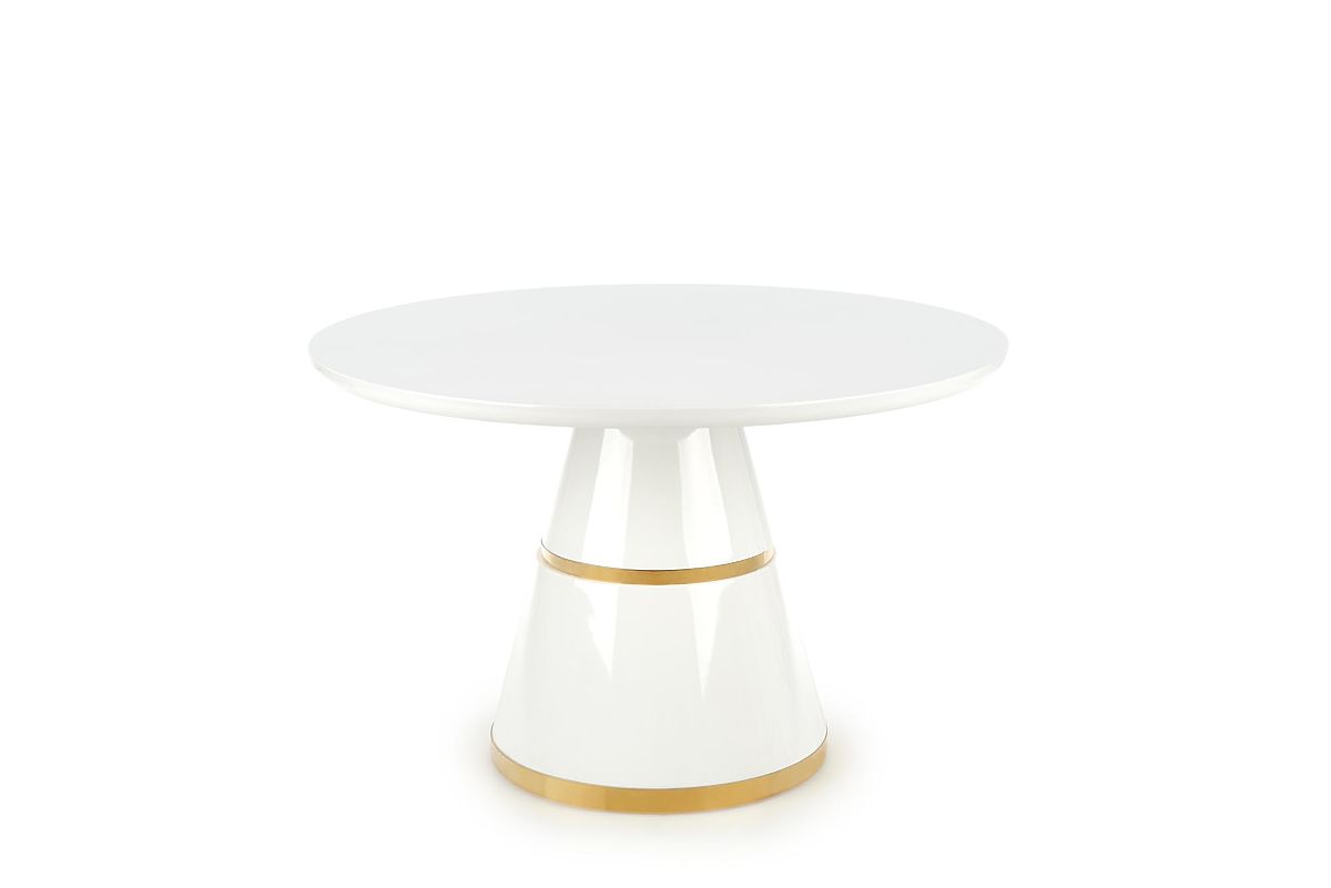 Runder Tisch mit weiß-goldenen Beinen und weißer Platte. .. mehr