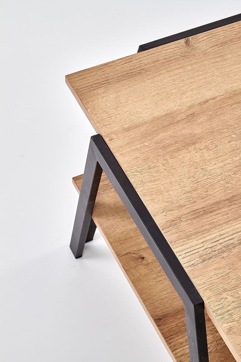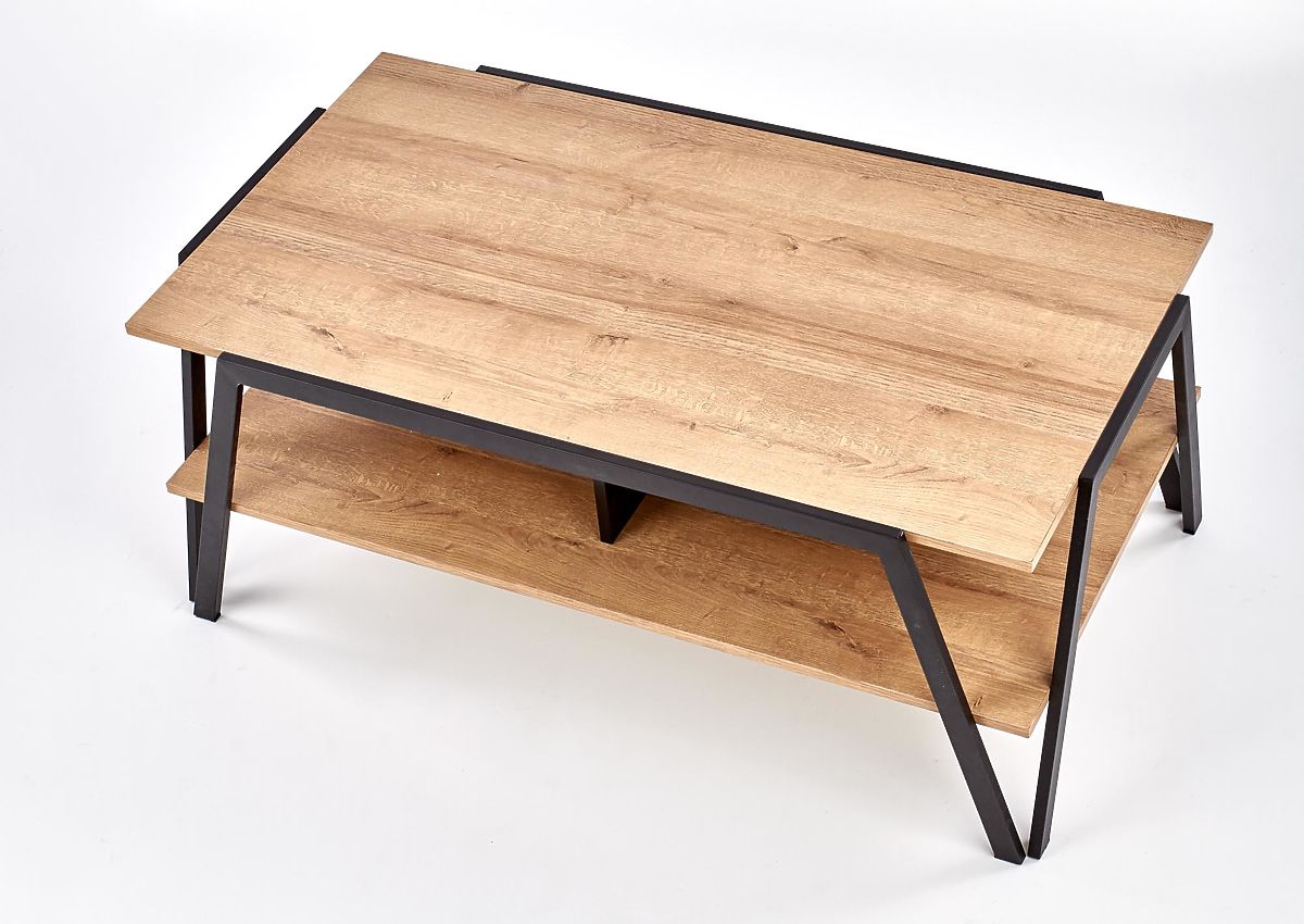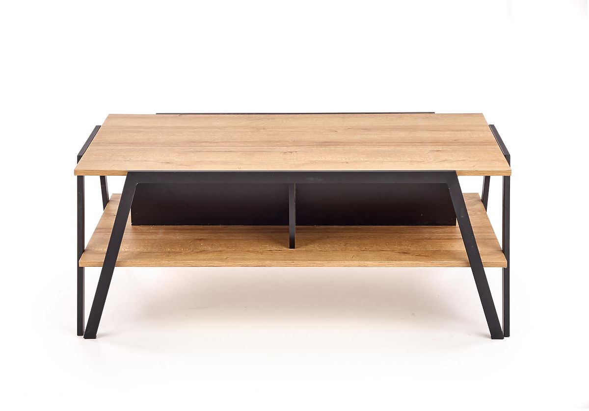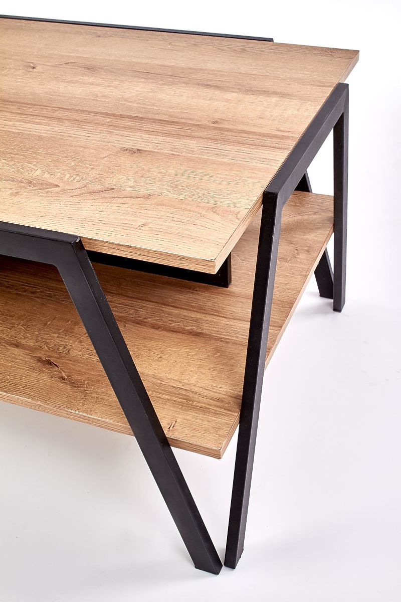 Der Couchtisch Volta ist die ideale Wahl für moderne Wohnzimmer und Arbeitszimmer, insbesondere in größeren Räumen, wo sein klarer Design und durchdachte Ausführung zur Geltung kommen. Er verbindet minimalistische Ästhetik mit industriellen Elementen und bietet ausreichend Ablagefläche für den täglichen Gebrauch. Der Tisch ist mit einer oberen und unteren Ablageplatte ausgestattet, die praktischen Platz für Bücher, Dekorationen, Zeitschriften und Snacks bieten. Die Konstruktion steht auf stabilen Beinen aus schwarz pulverbeschichtetem Stahl, die hohe Stabilität und Langlebigkeit gewährleisten. Die Platten sind aus furniertem MDF in goldener Eiche Dekor gefertigt, das dem Interieur ein warmes und elegantes Aussehen verleiht. Eine Tragfähigkeit von 30 kg für die obere und untere Platte garantiert eine problemlose tägliche Nutzung.