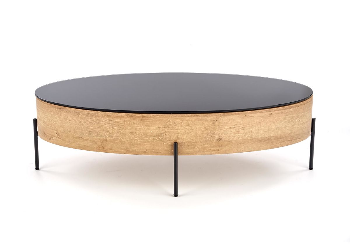 Bringen Sie moderne Eleganz in Ihr Wohnzimmer mit dem ovalen Couchtisch Zinga. Die Kombination aus schwarzem Glas und furniertem MDF in der Dekorfarbe goldene Eiche schafft ein stilvolles und zeitloses Aussehen, das jedes moderne Interieur perfekt ergänzt.