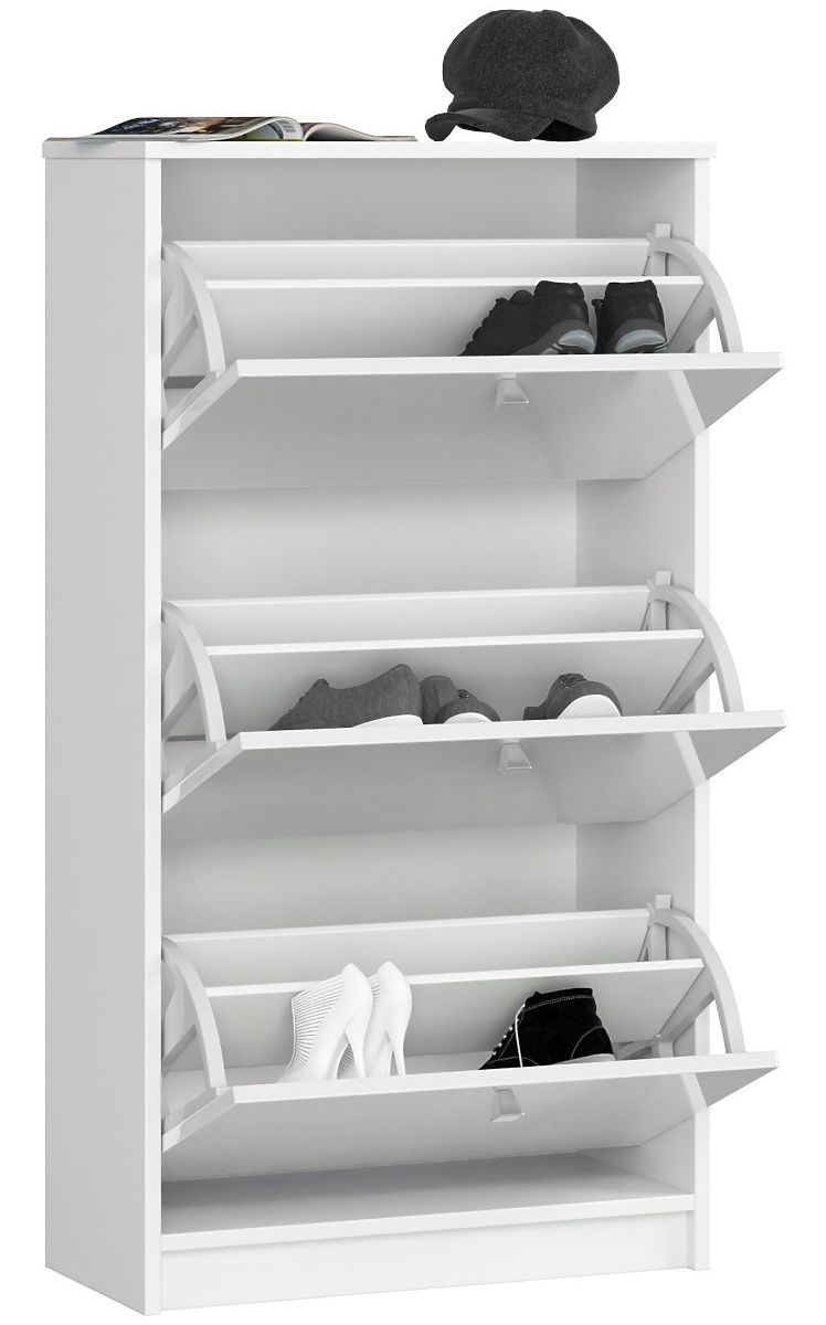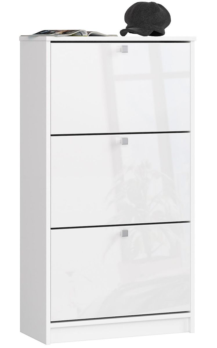 Der weiße Schuhschrank verfügt über drei Schubladen mit klappbaren Türen und Griffen in Satinoptik. Das Möbelstück ist zur Aufbewahrung aller Arten von Schuhen und Schuhpflegeprodukten bestimmt. Der Schuhschrank passt sowohl in große als auch in kleinere Flure. Das Möbelstück in einfacher Form und universeller Farbe passt gut zu modernen und klassischen Arrangements sowie zu Wänden in dunkleren und helleren Farben. Der Schuhschrank ist eine hervorragende Lösung für einen kleinen und unzureichend beleuchteten Flur, da Weiß den Raum optisch vergrößert und aufhellt. Der Korpus des Schuhschranks besteht aus einer laminierten Platte, die abrieb- und kratzfest ist. Die Kanten des Möbels sind sorgfältig mit einer widerstandsfähigen ABS-Kante versehen. Für die Herstellung der Fronten des Schuhschranks verwendete der Hersteller eine MDF-Platte mit einer langlebigen Acryloberfläche mit höchstem Glanzstandard, wodurch das Möbelstück besonders elegant wirkt. Der Schuhschrank lässt sich leicht sauber halten, indem man ihn mit einem trockenen oder feuchten Tuch abwischt.