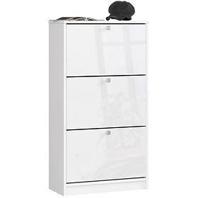 Weißer Schuhschrank mit drei klappbaren Türen und Hochglanzfronten. .. mehr