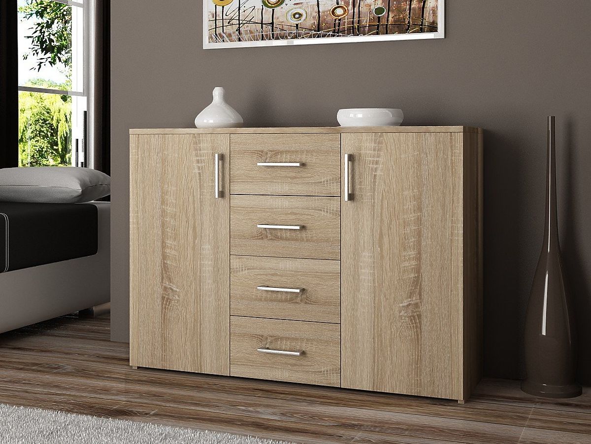 Kommode mit vier Schubladen und zwei großen Schränken in Eiche Sonoma. .. mehr