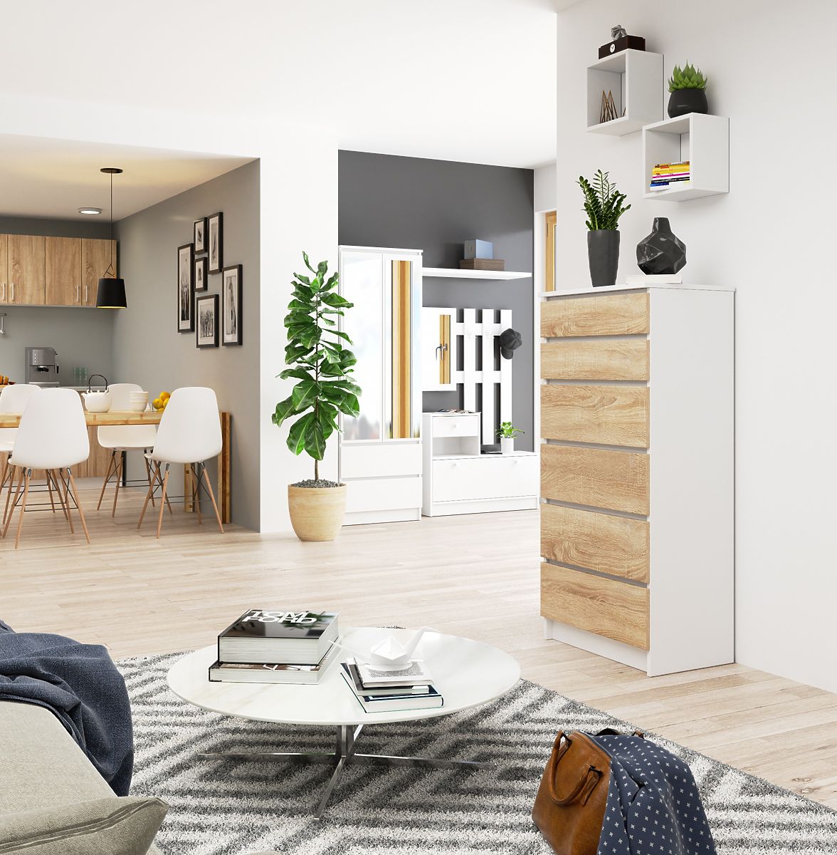 Kanten mit ABS-Kante versehen.MIX FARBEN KORPUS WEIß / FRONTEN SONOMA