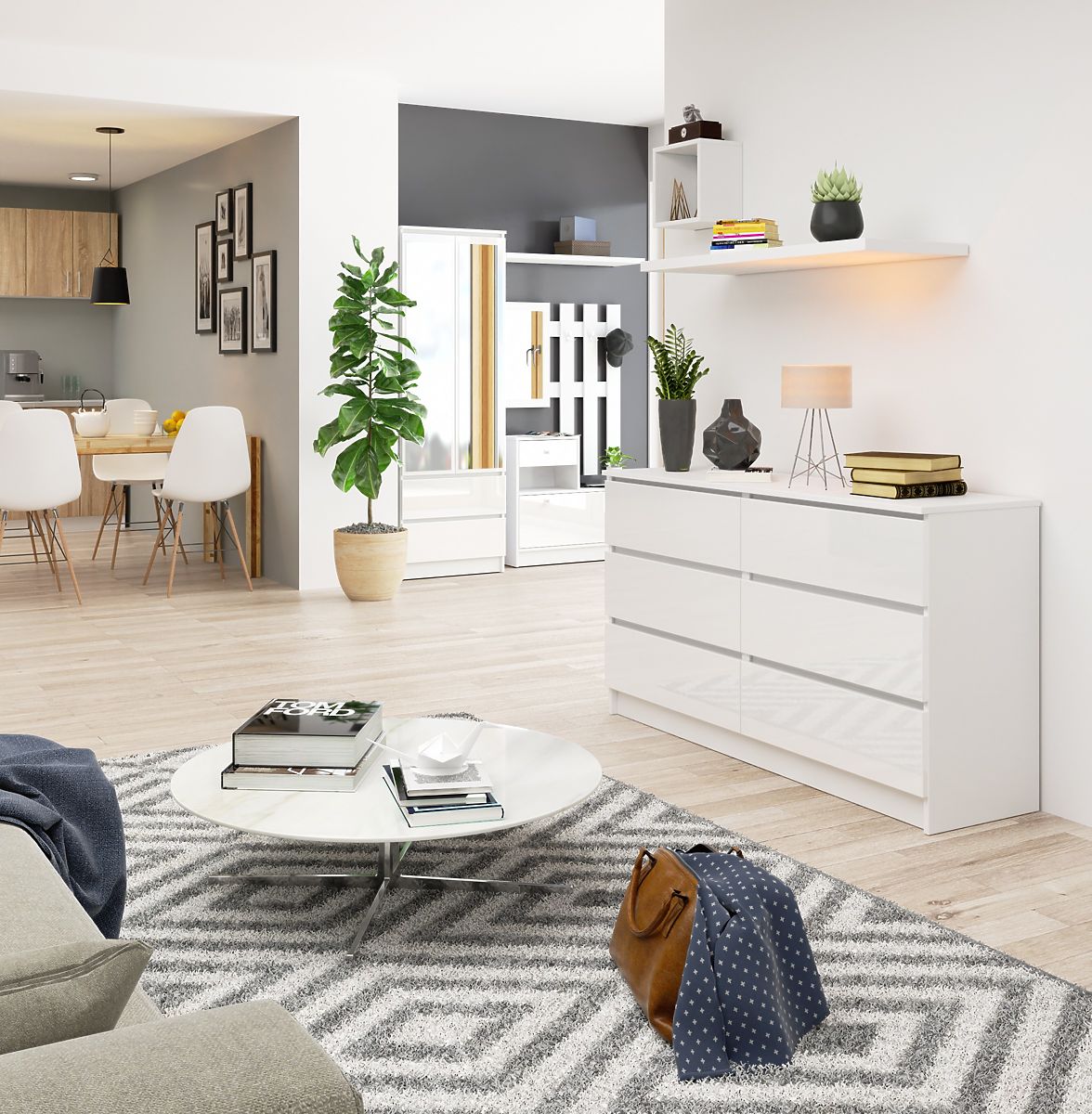 Kommode mit 6 Schubladen aus weißem Hochglanz-Acryl. .. mehr