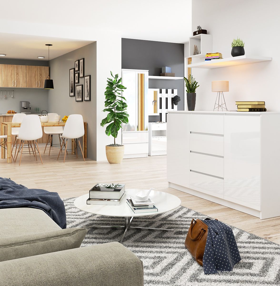 Tiefe - 40cm- Der Korpus der Kommode besteht aus 16mm weißem, halbmattem, abriebfestem laminiertem Plattenmaterial- Die Fronten sind aus 19mm ACRYLPLATTE im Dekor weißer Hochglanz gefertigt