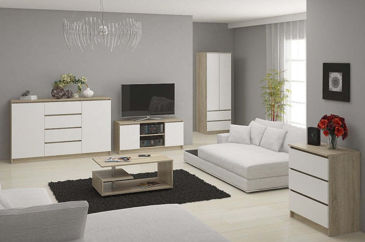Eiche Sonoma ist in letzter Zeit eine der beliebtesten Möbel-Farben geworden. Sie hat die Anerkennung der Kunden dank ihrer außergewöhnlich vielseitigen Natur gewonnen. Möbel in der Farbe Eiche Sonoma sind zudem sehr pflegeleicht, was ebenfalls ein unbestreitbarer Vorteil ist. Die zweite, ebenso beliebte Farbe ist das zeitlose Weiß. Die von uns angebotenen Möbel sind eine subtile Kombination dieser beiden Farben, was zu einem hervorragenden Effekt geführt hat.