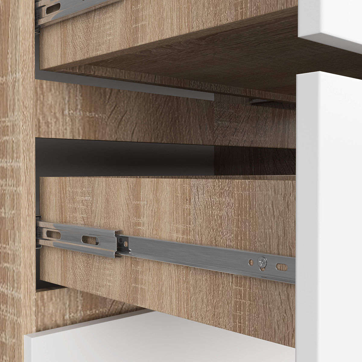 - Schubladen bewegen sich auf Metallkugelführungen