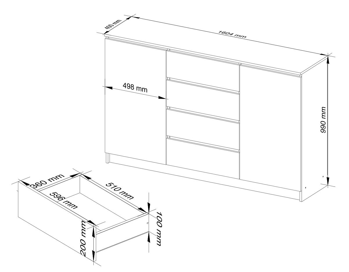 Die Kommode besteht aus einer hochwertigen laminierten Platte mit einer Dicke von 16 Millimetern. Es ist zu beachten, dass sie abriebfest ist und vom Hersteller KRONOSPAN stammt. Die Frontflächen der Schubladen sind ebenfalls aus laminierten Platten gefertigt. Die Schubladen bewegen sich auf Metallkugellaufschienen. Die Kanten des Möbels sind mit einer ABS-Kante beklebt, die einen hohen Schutz im Falle einer Beschädigung bietet. Hinter jeder Tür befinden sich zwei geräumige Regale, insgesamt vier. Darüber hinaus ist das Möbelstück mit vier praktischen Schubladen ausgestattet. Die Kommode ist für die Selbstmontage vorgesehen, die keine Schwierigkeiten bereiten sollte. Eine Anleitung ist zusammen mit den Teilen im Lieferumfang enthalten. Kunden können sich auf eine 24-monatige Garantie verlassen.