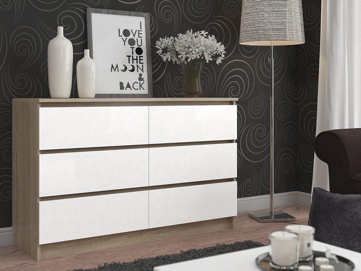 Elegant, stilvoll und modern. Diese drei Adjektive beschreiben unsere Kommode. In zeitlosen Farben gehalten. Der Korpus ist in der Farbe Sonoma, während die Schubladenfronten weiß sind. Unser Angebot für unsere Kunden hat eine Länge von 120 Zentimetern, eine Höhe von 77 Zentimetern und eine Tiefe von 40 Zentimetern. Gerade die letzte Abmessung macht unser Möbelstück so geräumig. Natürlich spielen auch die sechs Schubladen für verschiedene Accessoires, Kleidung und Schuhe eine Rolle. Die bereits erwähnten Schubladen bewegen sich sanft und präzise, dank der Metallkugelführungen.
