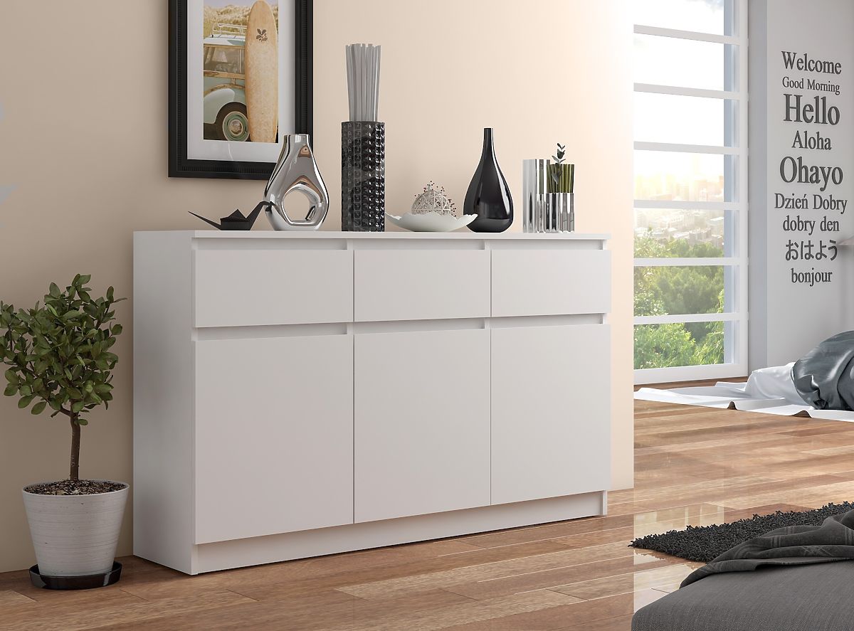 Die Kommode ist für die Selbstmontage vorgesehen. Jeder Bestellung liegt eine Anleitung bei, die einfach und übersichtlich erklärt, wie die Möbel zusammengebaut werden. Obwohl die Kommode durch hohe Widerstandsfähigkeit und Langlebigkeit besticht, gewähren wir eine Garantie von 24 Monaten. Bei der Bestellung können Sie sicher sein, dass das Produkt in einwandfreiem Zustand ankommt. Unsere Kommode ist einfach in der Form, wodurch sie sich leicht an verschiedene Arten von Innenraumgestaltungen anpassen lässt. Sie passt hervorragend sowohl ins Wohnzimmer als auch in den Flur oder das Schlafzimmer. Sie ist geräumig und funktional. Auf ihrer Platte können verschiedene dekorative Gegenstände platziert werden, wodurch die Möbel Charakter erhalten. Die Kommode ist im Geist zeitloser Eleganz entworfen, weshalb sie sich durch Vielseitigkeit auszeichnet. Ihr Vorteil ist auch die sorgfältige Verarbeitung und hohe Widerstandsfähigkeit gegen Beschädigungen. Sie ist 99 cm hoch und 138 cm lang. Die Kommode wiegt insgesamt 65 kg. Ihr Farbton ist edles Weiß.