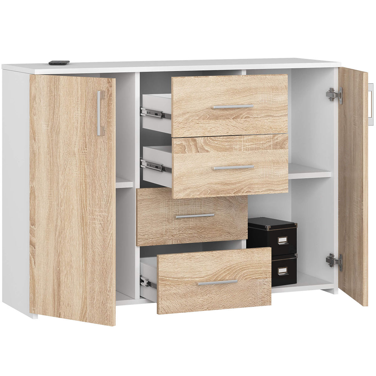 Kommode mit 4 Schubladen und 2 Türen in Weiß und Eiche Sonoma. .. mehr