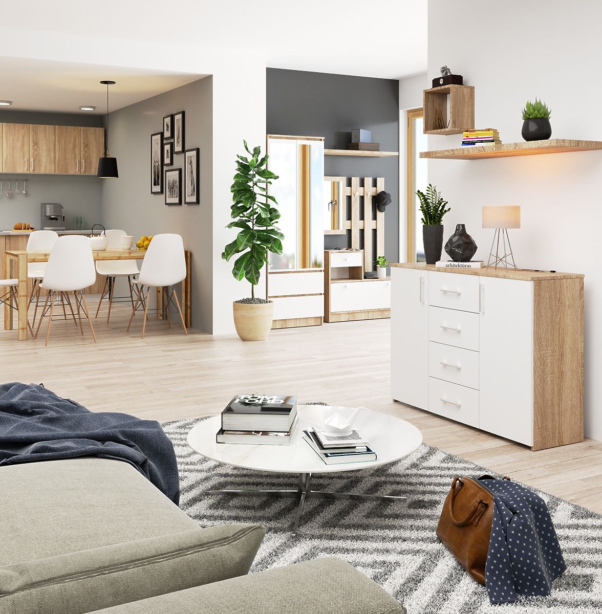 Die Kommode, Modell K 45, ist eine hervorragende Antwort auf die Bedürfnisse der heutigen Nutzer. Hergestellt in mattem Weiß mit einem Hauch von effektvoller Artisan-Eiche, spiegelt sie Natur und Eleganz wider. Eine solche ungewöhnliche Lösung bietet den Nutzern ein breites Spektrum an Gestaltungsmöglichkeiten, die nur durch die Vorstellungskraft begrenzt werden können.