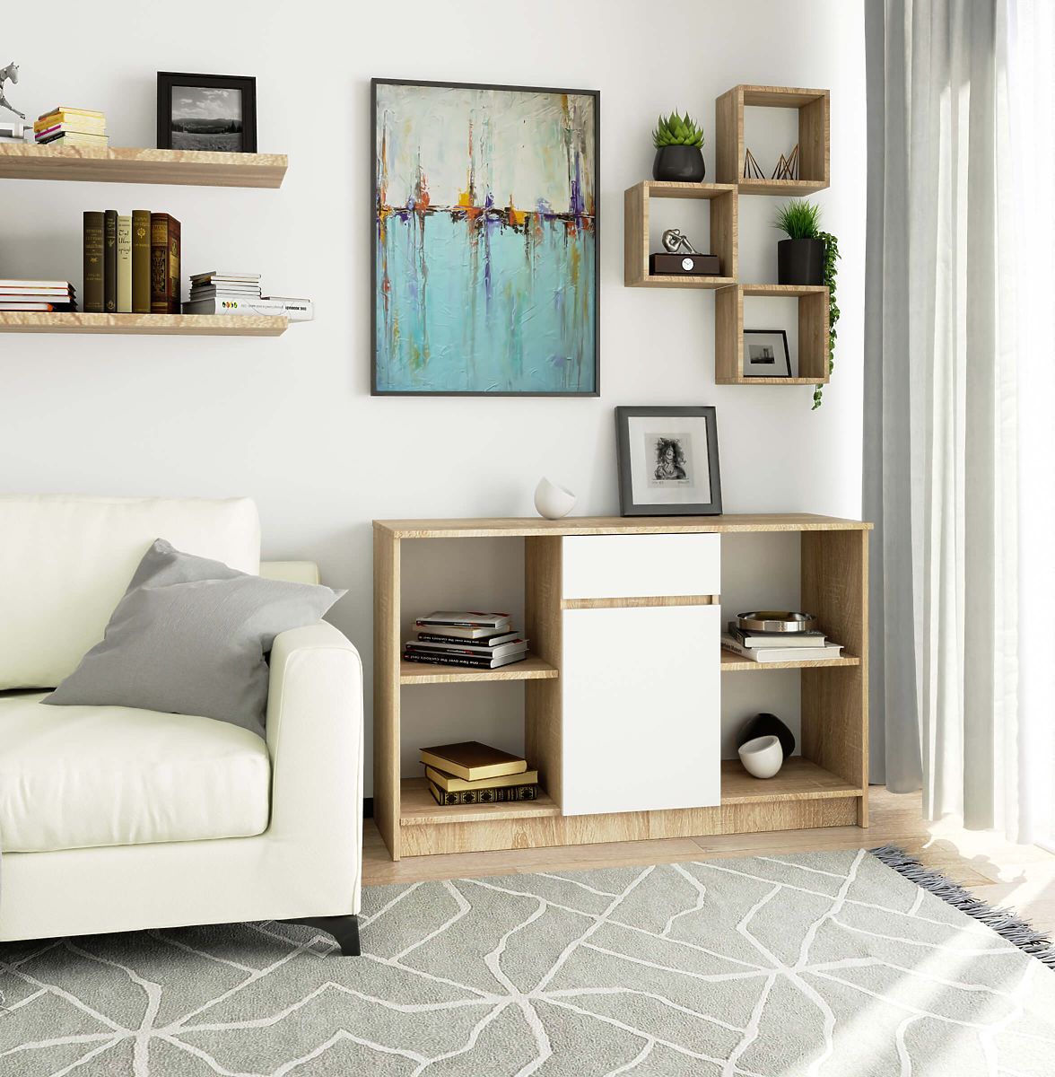 Das durchdachte Design der Kommode B-17 macht sie geeignet für Räume wie Wohnzimmer, Schlafzimmer, Flur oder Ankleidezimmer. Sie kombiniert offene Regale mit einem geschlossenen Schrank und einer Schublade. Die Schublade kann blockiert werden, was die Aufbewahrung von wertvollen Gegenständen ermöglicht. Es ist ein großartiger Platz für Kleinigkeiten, Souvenirs und verschiedene Dekorationen. Die Kombination aus Weiß und hellem Holz macht sie geeignet für moderne Arrangements.