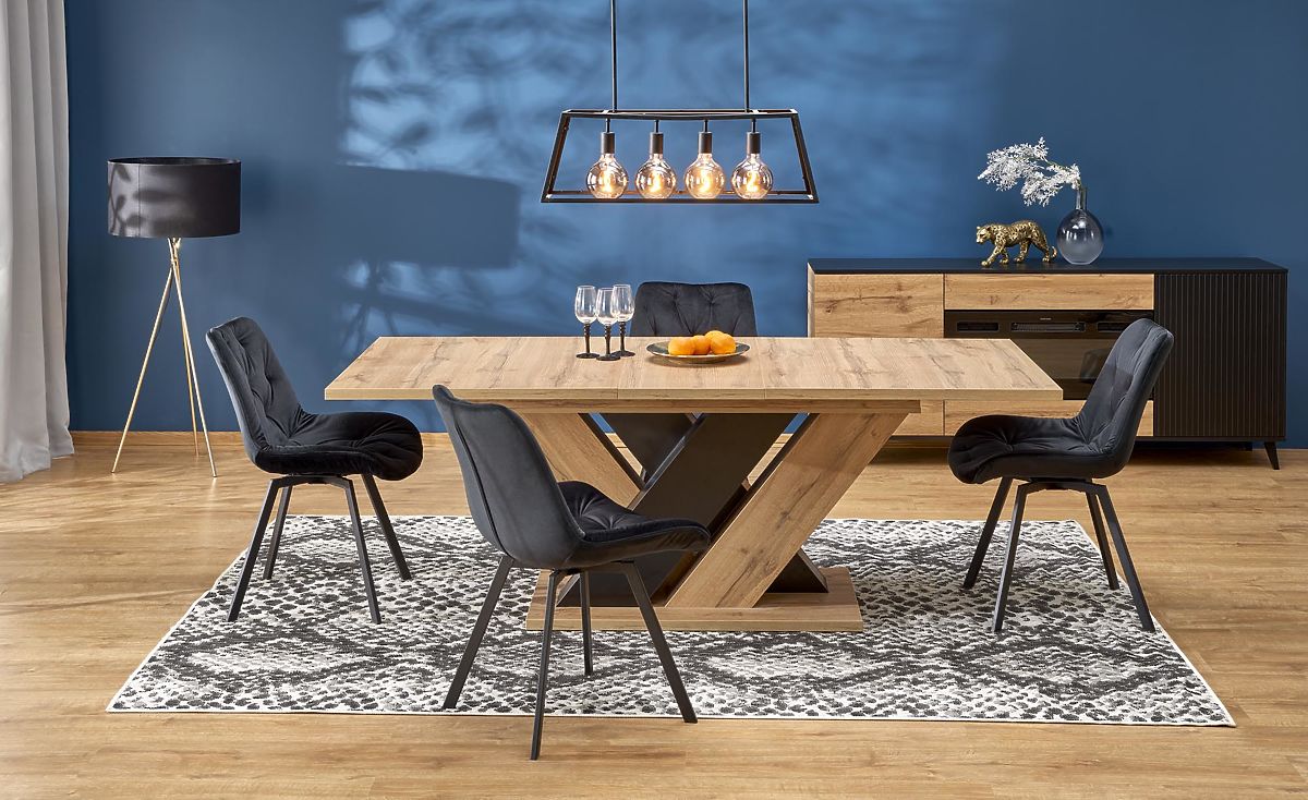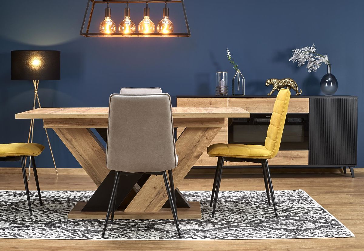 Die interessante Gestaltung der Beine, die aus einer Platte in Kombination der Dekore Eiche Wotan und Schwarz gefertigt sind, verleiht dem Tisch ein einzigartiges Aussehen und schafft ein markantes Element im Interieur. Die Konstruktion in X-Form sorgt gleichzeitig für hervorragende Stabilität und Festigkeit, sodass Sie sich keine Sorgen über unerwünschtes Wackeln oder Verrutschen machen müssen.