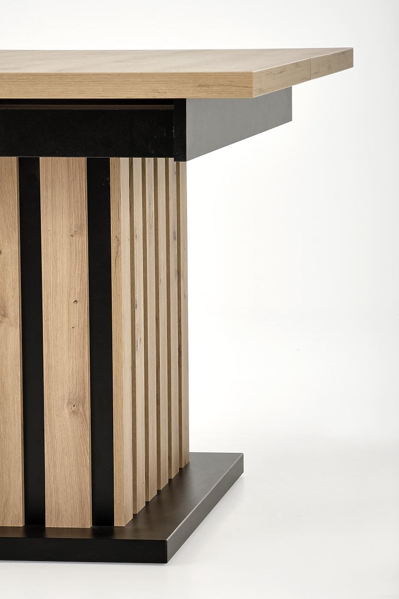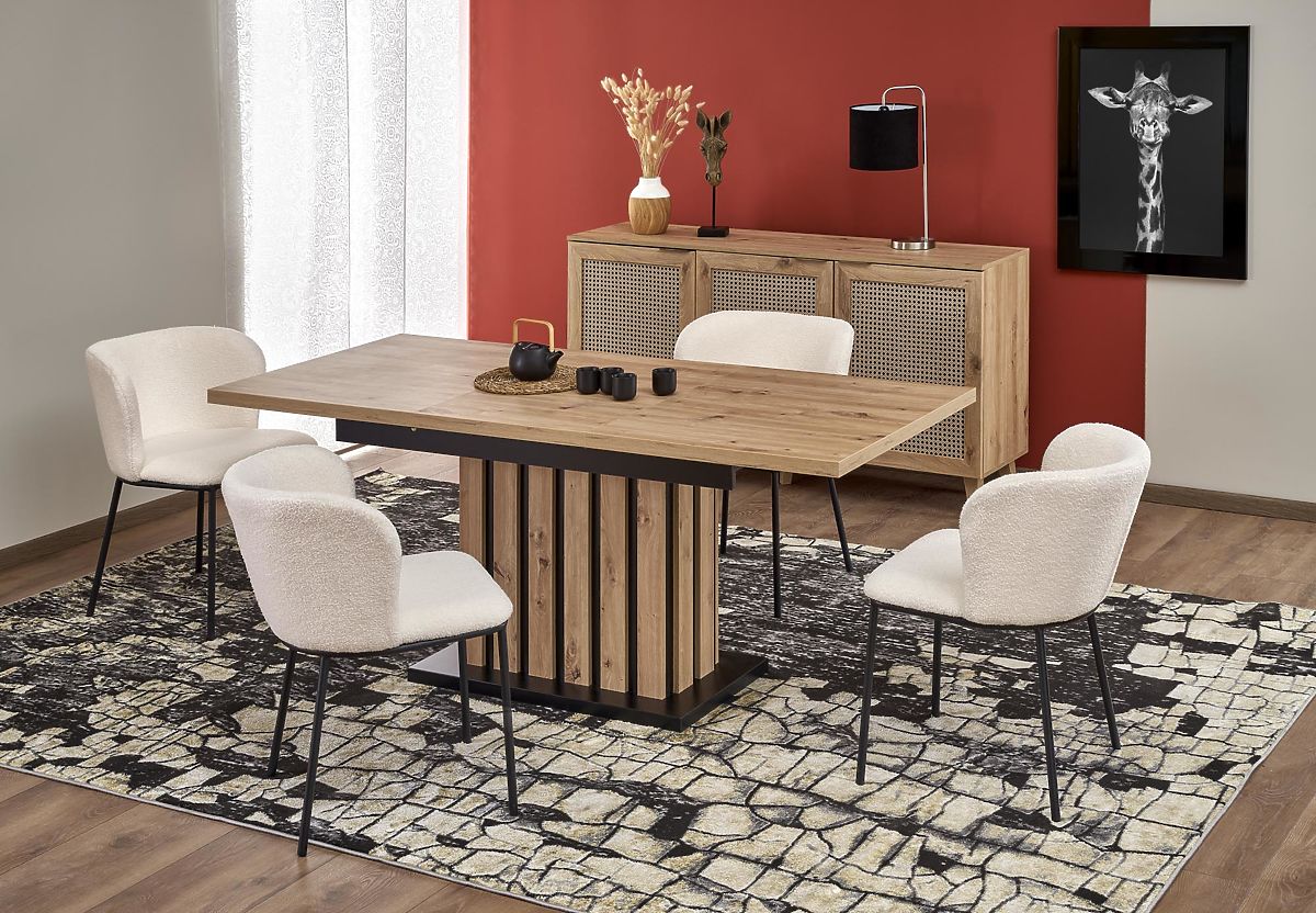 Der Tisch besteht aus strapazierfähiger laminierter Spanplatte, die natürliches Holz imitiert und eine lange Lebensdauer sowie einfache Pflege gewährleistet. Das zentrale Gestell kombiniert schwarze und hölzerne Elemente, bietet Stabilität und gleichzeitig ausreichend Beinfreiheit für alle Gäste.