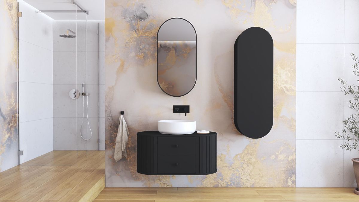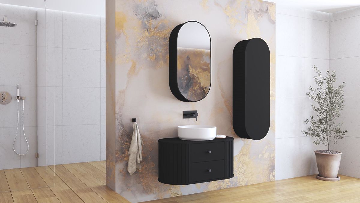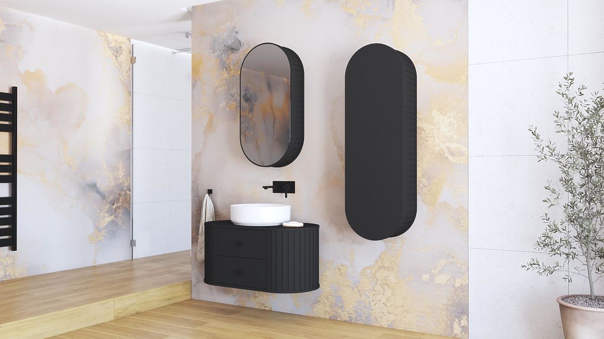 Schwarzer Spiegelschrank mit Soft-Close und Push-to-Open-System. .. mehr