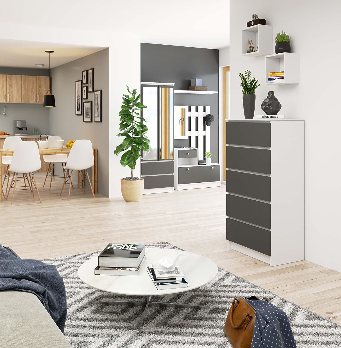Kommode mit 5 Schubladen in Weiß und Grafit Grau. .. mehr