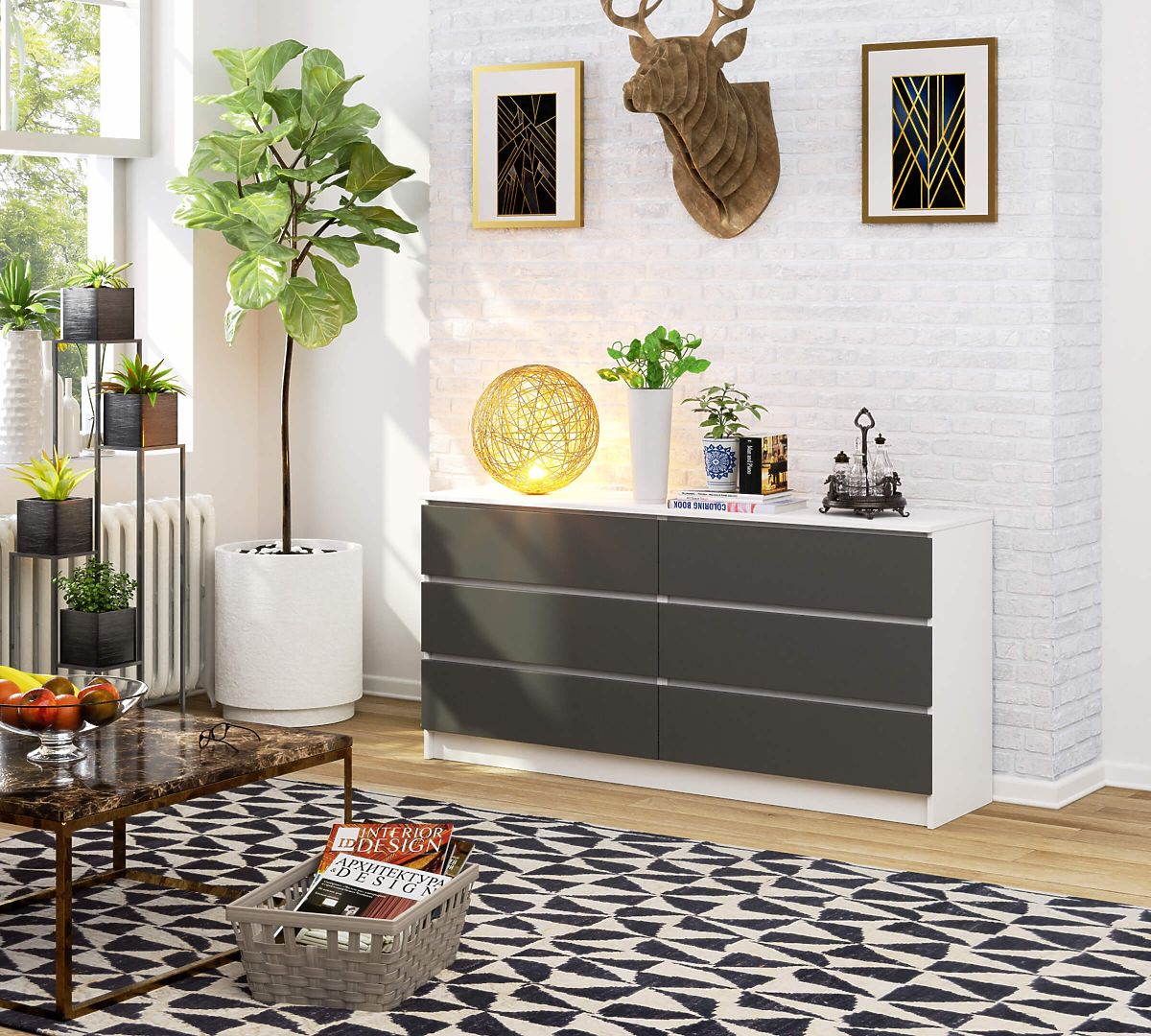 Moderne Kommode mit sechs geräumigen Schubladen in Weiß und Grafitgrau. .. mehr