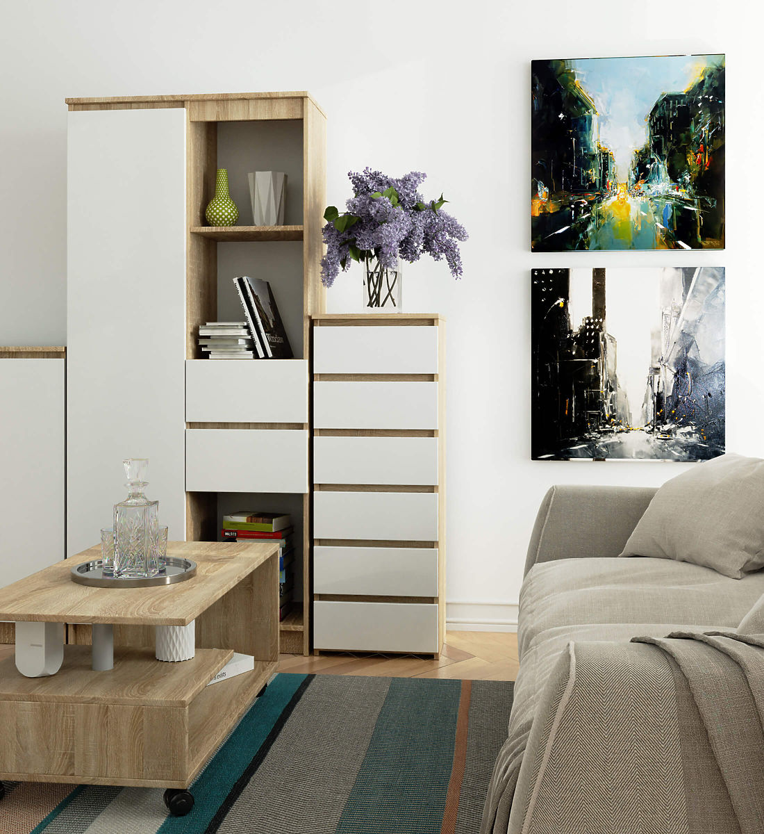Kommoden sind ein beliebter Möbeltyp, der neben dem Bett platziert wird. Auf der Platte befindet sich meist eine Lampe, während im Inneren Gegenstände aufbewahrt werden, die Entspannung und Schlaf erleichtern. Personen, die eine elegante Kommode suchen, sollten auf die Kommode CL6 40 cm in der Farbe Eiche Sonoma mit weißen Fronten achten. Sie wird in jedem Schlafzimmer schön zur Geltung kommen. Sie kann auch im Kinderzimmer platziert werden.