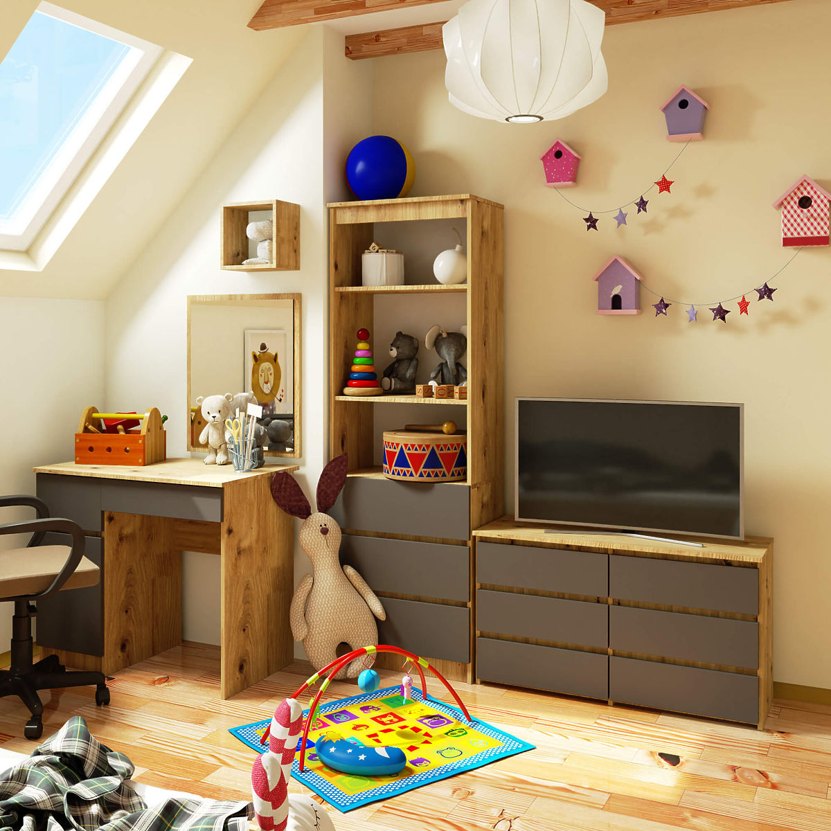 Im Möbelbau wird besonderer Wert auf die Funktionalität der Produkte und ihre hohen ästhetischen Werte gelegt. Ein hervorragendes Beispiel ist die Kommode CL 100 cm. Dieses praktische Möbelstück ist aus abriebfestem laminiertem Plattenmaterial gefertigt, was seine Langlebigkeit und Robustheit garantiert. In den sechs geräumigen Schubladen finden verschiedene Bücher, Dokumente oder Kleinigkeiten Platz. Einige unserer Kunden entscheiden sich dafür, Kleidung oder Unterwäsche darin aufzubewahren. Die Kommode in Eiche Artisan mit grauen Fronten hat ein elegantes Design. Die schlichte Form und das elegante Design passen sowohl in klassische und elegante als auch in romantische Interieurs. Dieses außergewöhnliche Möbelstück präsentiert sich perfekt in einem eleganten Wohnzimmer oder einem gemütlichen Schlafzimmer. Es wird auch oft als Teil eines Kleiderschranks oder Flurs verwendet. Die Kommode mit 6 Schubladen wird sowohl von Einzelkunden als auch von Unternehmern geschätzt. Dank ihres makellosen Aussehens und ihrer außergewöhnlichen Kapazität eignet sie sich hervorragend als Teil der Büroausstattung.