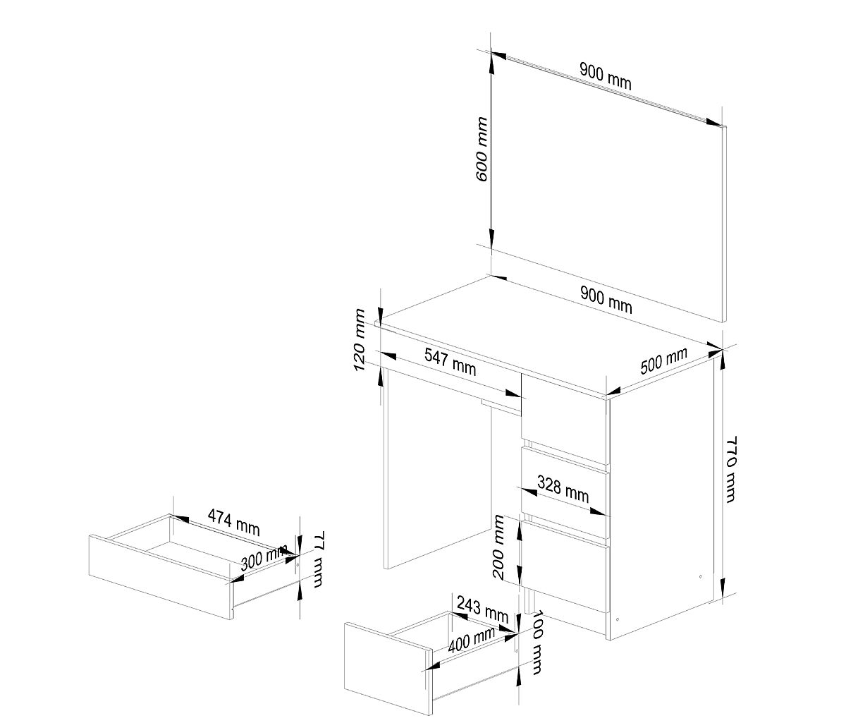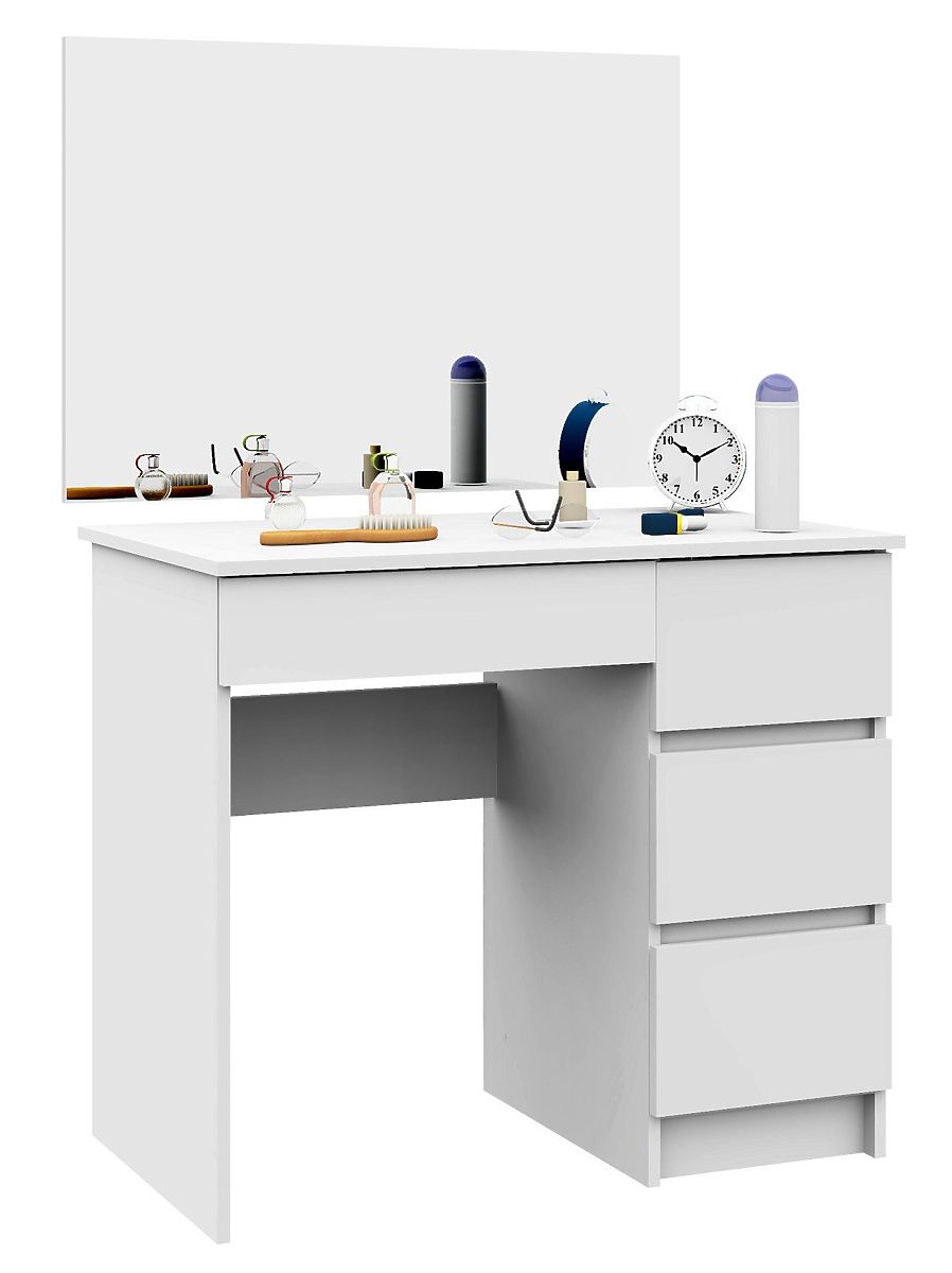 Der kosmetische Schminktisch mit Spiegel ist ein hervorragendes Möbelstück für Make-up. Der Schminktisch hat eine funktionale Platte, auf die die notwendigsten Dinge gelegt werden können, und vier geräumige Schubladen, die alle Kleinigkeiten aufnehmen. In Kombination mit dem angepassten Spiegel schafft der Schminktisch ideale Bedingungen für Make-up, und die tägliche weibliche Routine wird von nun an viel angenehmer. Die geeigneten Maße des Schminktisches (77 cm Höhe, 90 cm Breite, 50 cm Tiefe) sorgen für bequeme Bewegung und Nutzung des Schminktisches. Der umfangreiche Spiegel (60 cm x 90 cm) ermöglicht eine präzise Ausführung auch der kompliziertesten kosmetischen Aufgaben. Dieses Set bewährt sich auch in kleinen Räumen. Der Schminktisch ist aus strapazierfähiger, abrieb- und schadenresistenter laminierter Platte gefertigt, und die neutrale, modische weiße Farbe passt in jedes Interieur. Ideal für das Schlafzimmer oder einen anderen Raum, erfreut es jede Frau, die sich um ihre Schönheit kümmert.