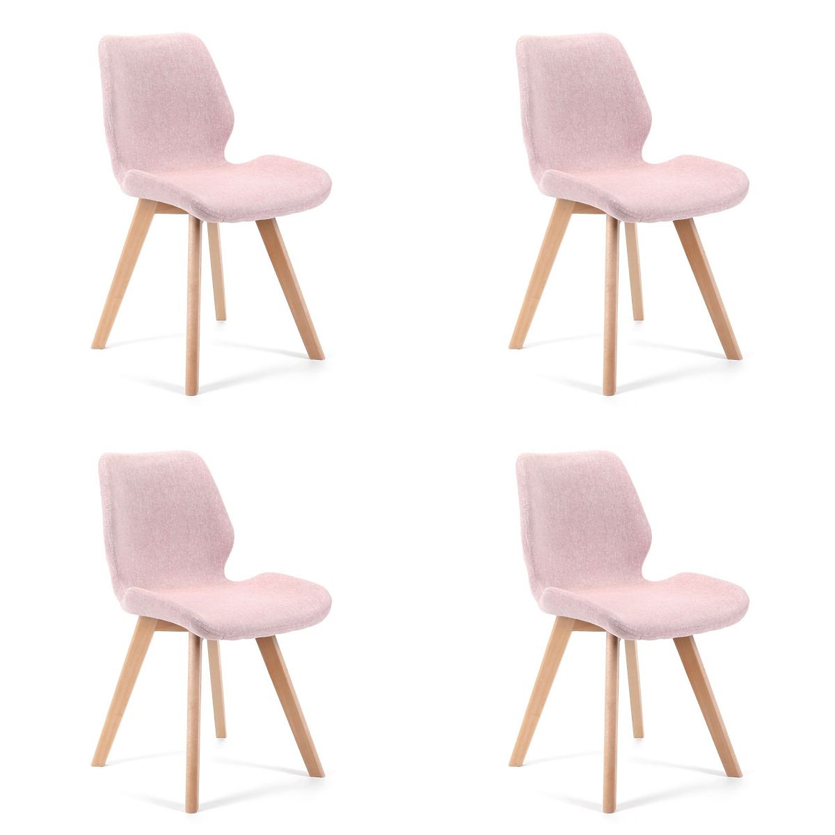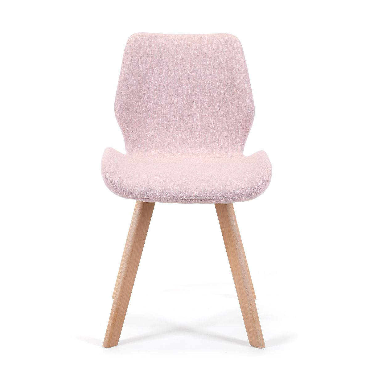 Stuhl im skandinavischen Stil mit rosa Stoffbezug und Holzbeinen. .. mehr