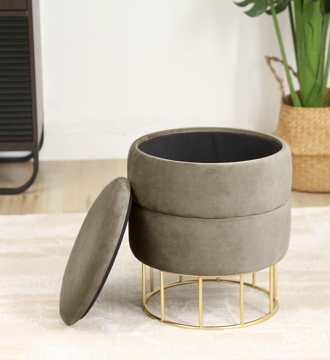 Runder Pouf mit Stauraum und goldenen Metallbeinen. .. mehr