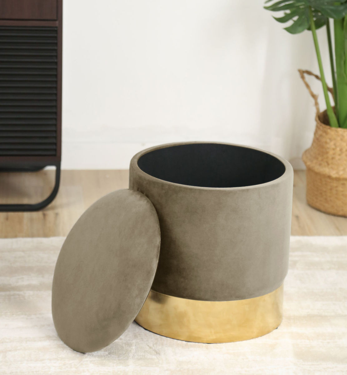 Puff mit Stauraum auf einer goldfarbenen Metallbasis.