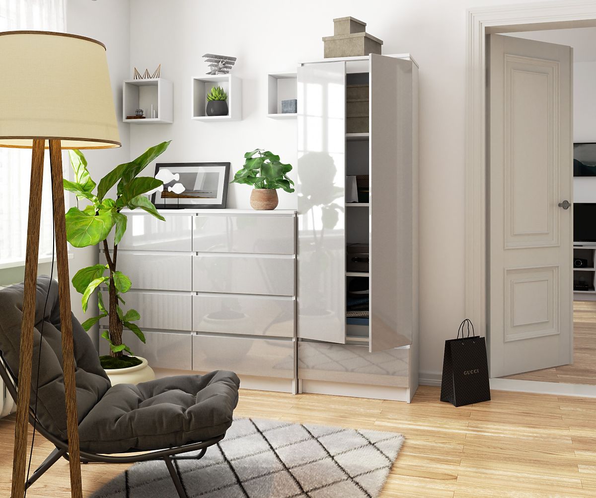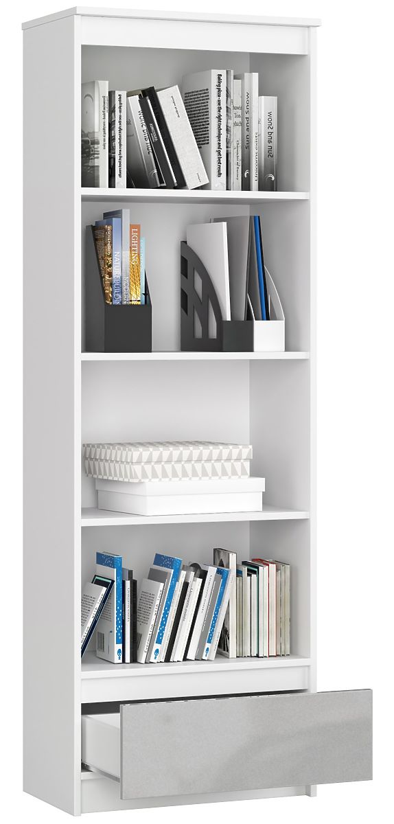 Das Regal ist ein Möbelstück, das in jedem Haushalt Verwendung findet. Es kann zur Aufbewahrung von Büchern, Ordnern und Dokumenten, Fotoalben, aber auch von Bilderrahmen, Souvenirs oder vielen anderen Gegenständen dienen. Am häufigsten ist es im Jugendzimmer, Wohnzimmer oder Homeoffice zu sehen, eignet sich aber auch hervorragend für Büroräume. Das vorgestellte Regal ist eine Kombination aus gutem Preis, Funktionalität, Qualität und Design. Es verdient Anerkennung durch die Kombination der zwei modischsten und gleichzeitig zeitlosen Farben - Weiß und Grau. Das Regal besteht aus vier großen Regalböden und einer geräumigen Schublade. Der Schrank ist sehr stabil, zeichnet sich durch eine solide Konstruktion und Liebe zum Detail aus. Er ist aus einer laminierten Platte mit überdurchschnittlicher Haltbarkeit und Abriebfestigkeit gefertigt. Die Fronten sind in glänzendem Grau gestaltet, was dem Ganzen einen einzigartigen Charakter verleiht. Wir laden Sie auch ein, sich mit weiteren Büromöbelelementen aus dieser Kollektion vertraut zu machen.