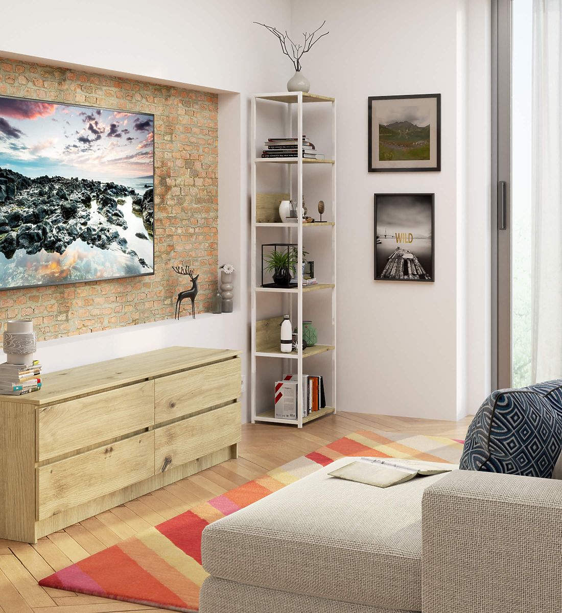 - Elegantes Aussehen: Das Regal zeichnet sich durch eine einfache Form aus, der Rahmen ist in Weiß, während die Platte in Eiche Artisan gehalten ist,