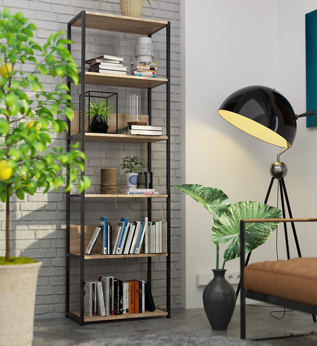 Das Metall-Loftregal ist ein praktisches und modernes Möbelstück, das sowohl für das Wohnzimmer als auch für das Büro geeignet ist. Regal mit schwarzem Metallrahmen und 6 Regalböden in der Farbe Sonoma Eiche. Die Regalböden bestehen aus einer 16 mm dicken laminierten Platte. Es ist ein langlebiges und widerstandsfähiges Material, das sich durch hohe Abriebfestigkeit auszeichnet. Die Kanten sind zusätzlich mit einer ABS-Kante geschützt, wodurch das Möbelstück auch bei sehr intensiver täglicher Nutzung gut aussieht. Das Regal ist mit 6 Regalböden ausgestattet, auf denen Gegenstände platziert werden können, die wir ausstellen oder einfach griffbereit haben möchten. Insgesamt wirkt es sehr stilvoll und modern.