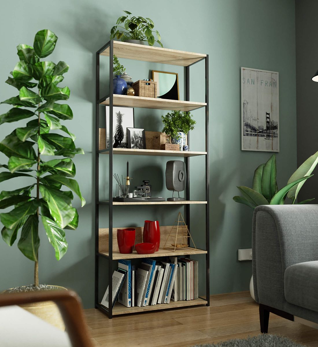 Metallisches Loft-Regal mit 6 Sonoma Eiche Regalböden und schwarzem Rahmen. .. mehr