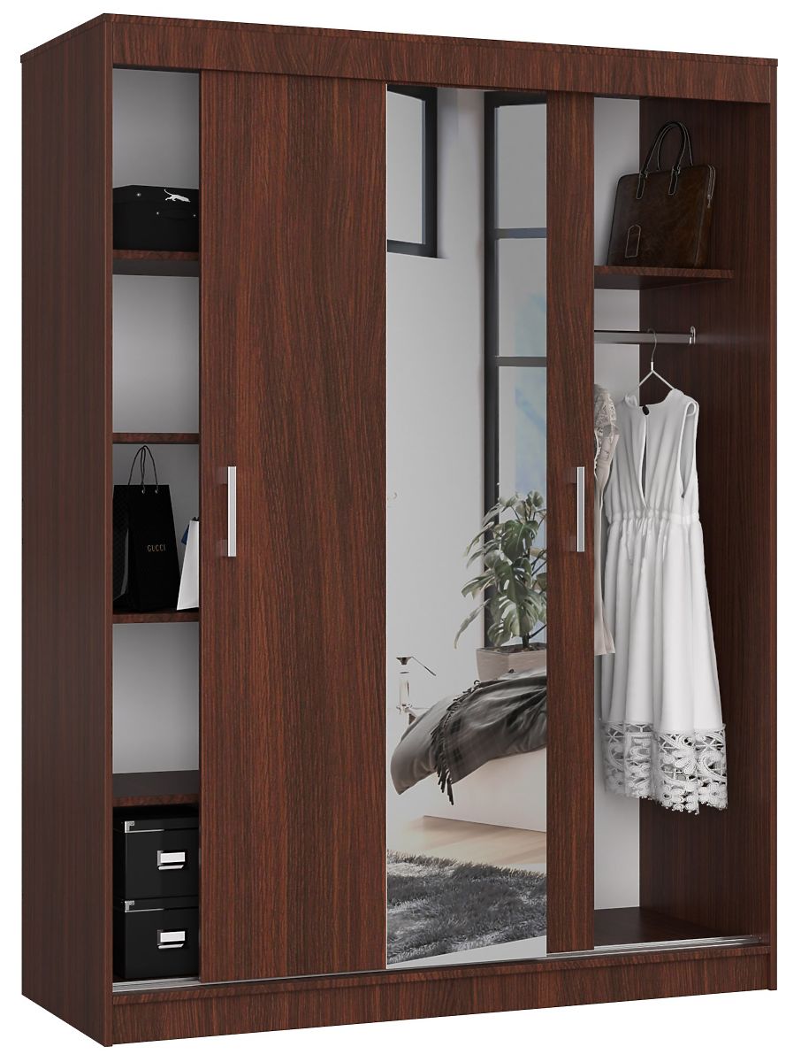 Ein Schiebetür-Schrank in der Farbe Wenge mit einer Länge von 150 cm, ausgestattet mit Regalen und einer Kleiderstange. Große Nutzfläche.